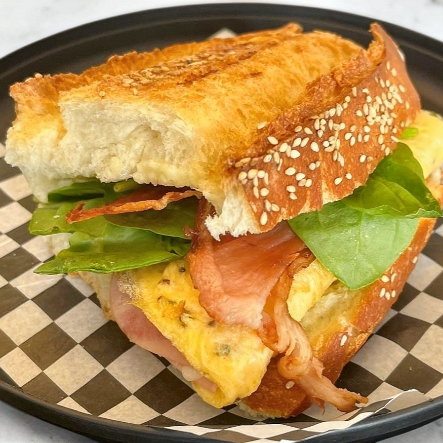 Base de aguacate, mayonesa, pequeño omelette de jamon con queso, tocino espinacas, aderezo agridulce y mayonesa