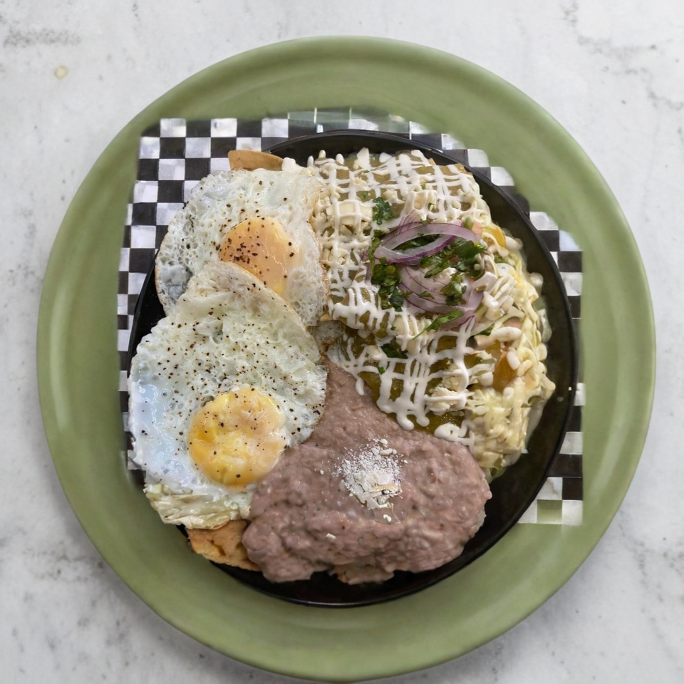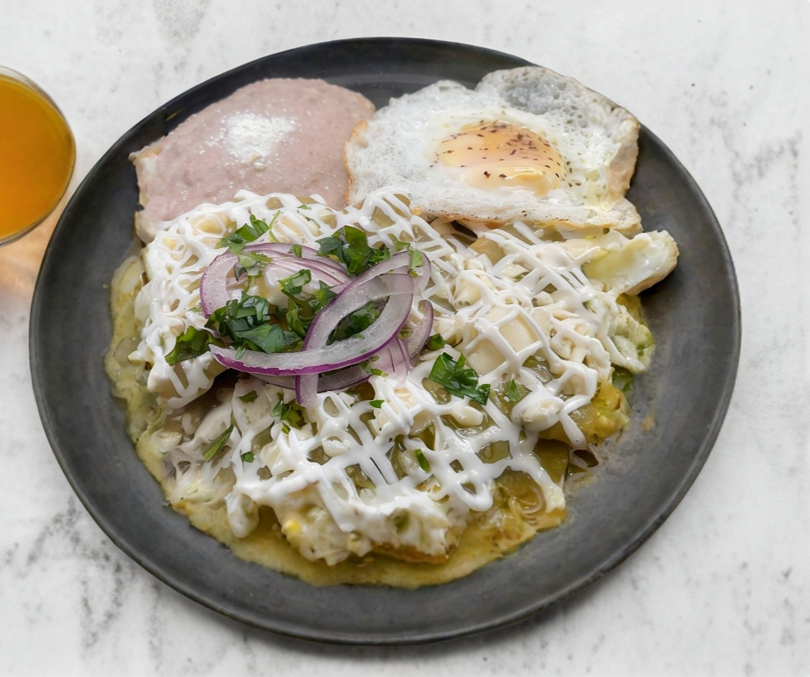 Totopos en salsa verde queso derretido frijoles crema cebolla y cilantro 2 huevos estrellados