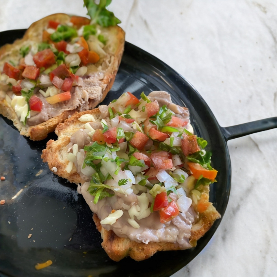 Molletes con base de frijoles y queso gratinado , por encima pico de gallo