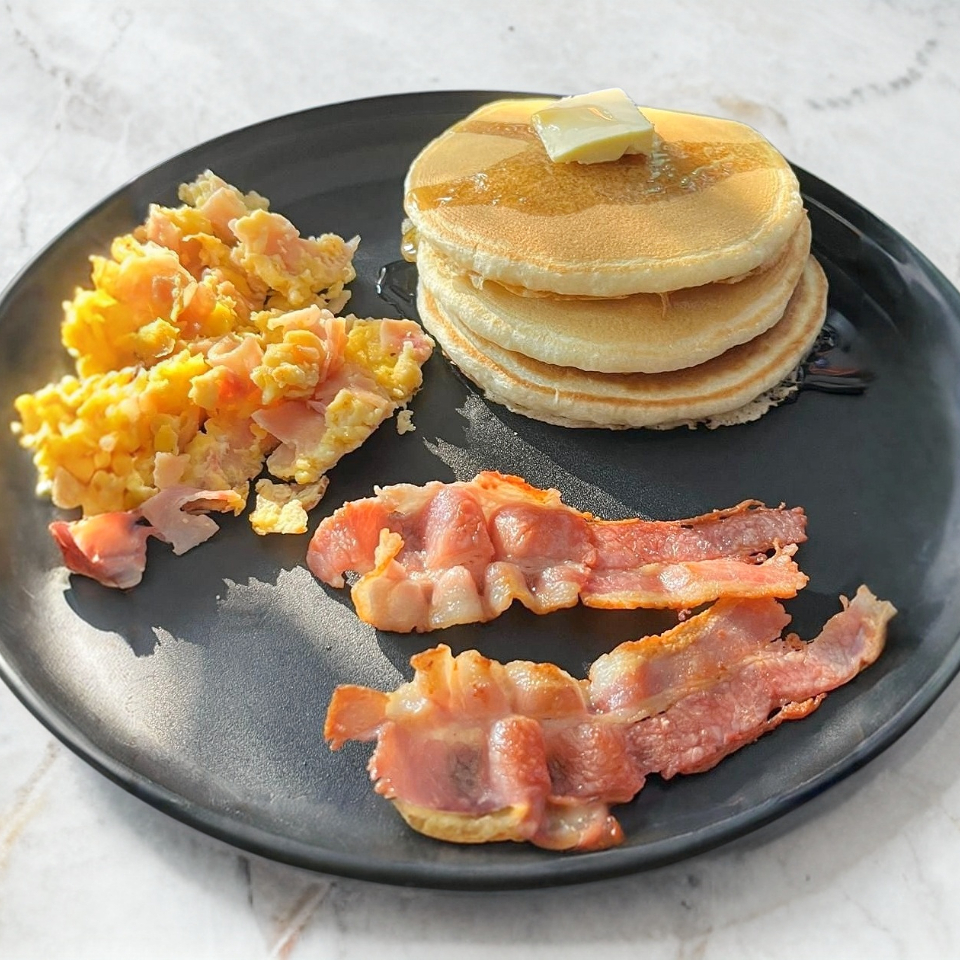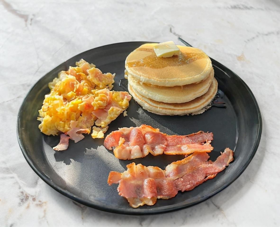 3 pequeños hot cakes, huevito con jamon y tocino. Miel y mantequilla