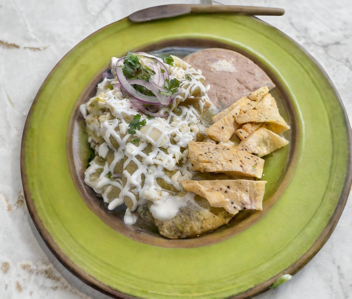 Totopos en salsa verde queso derretido frijoles crema cebolla y cilantro.