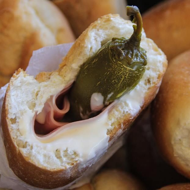 Bolillo crujiente con crema, jamon y chile en vinagre.