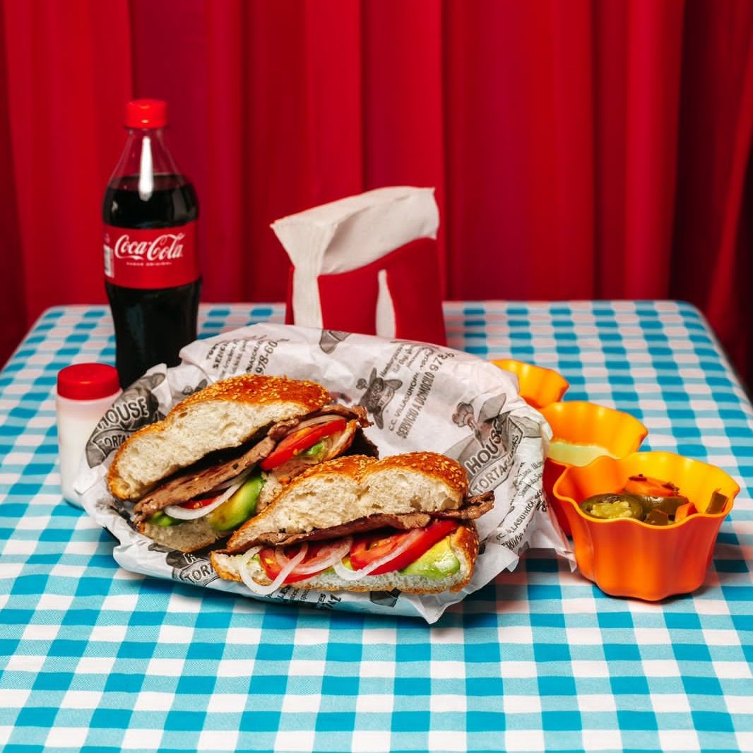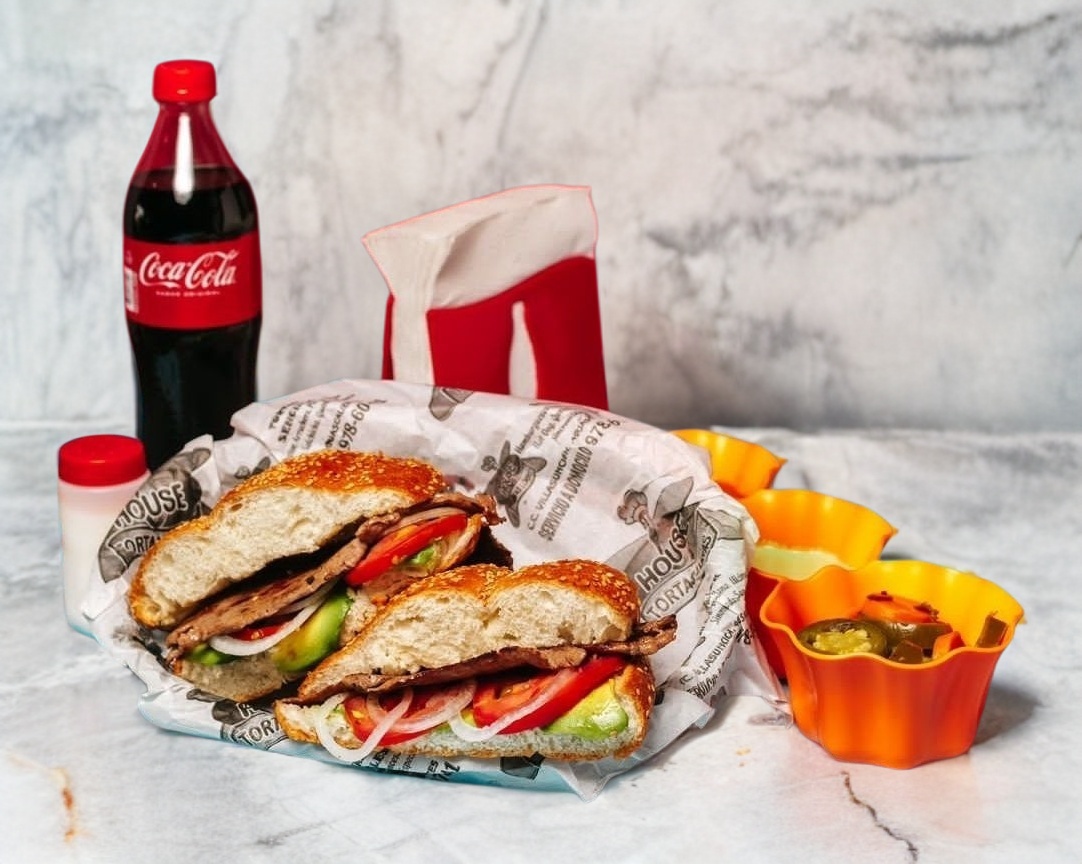 Deliciosa torta de arrachera con aguacate, jitomate y cebolla, acompañada de un refresco Productos Coca-Cola de 600 ml en botella plástica.
