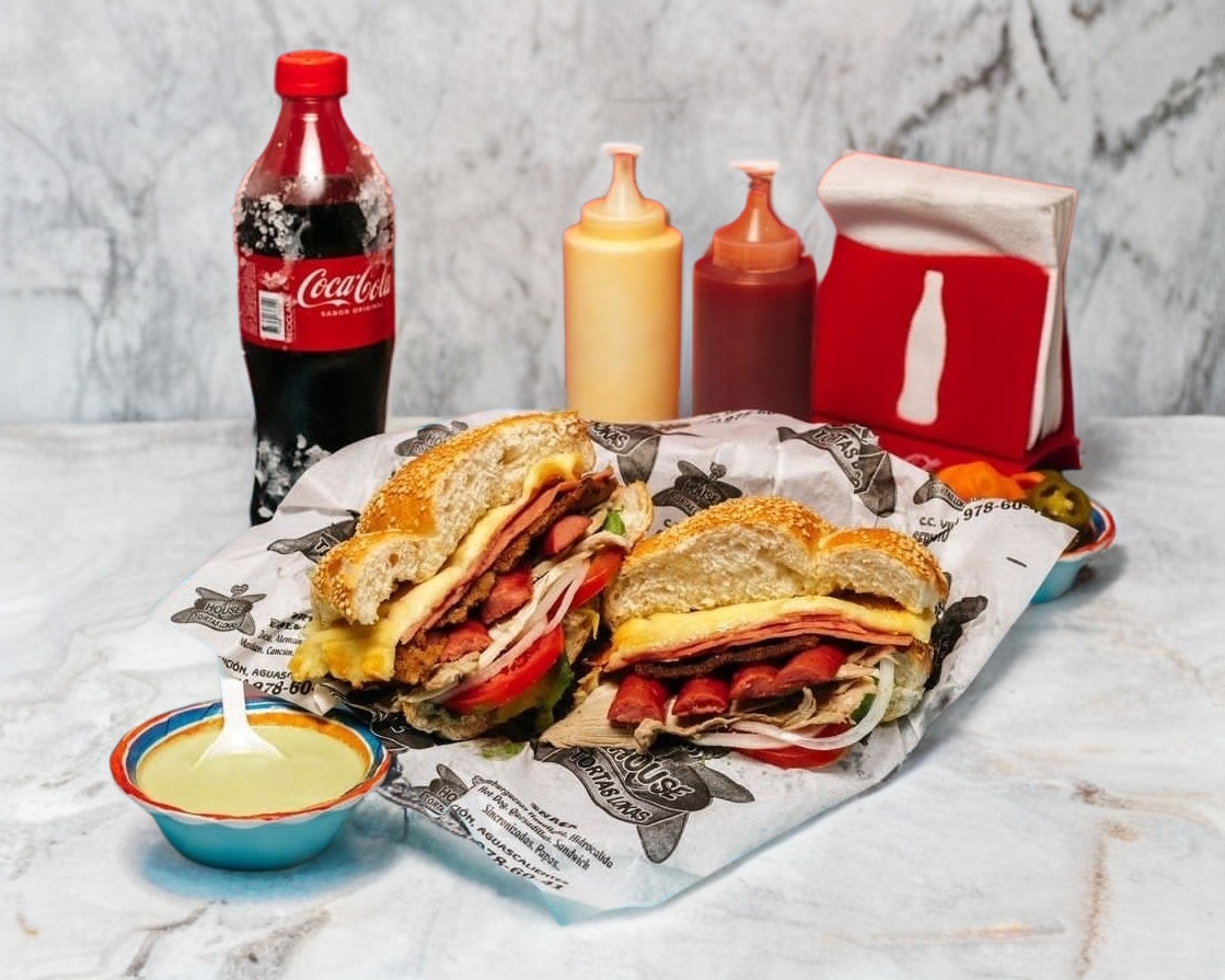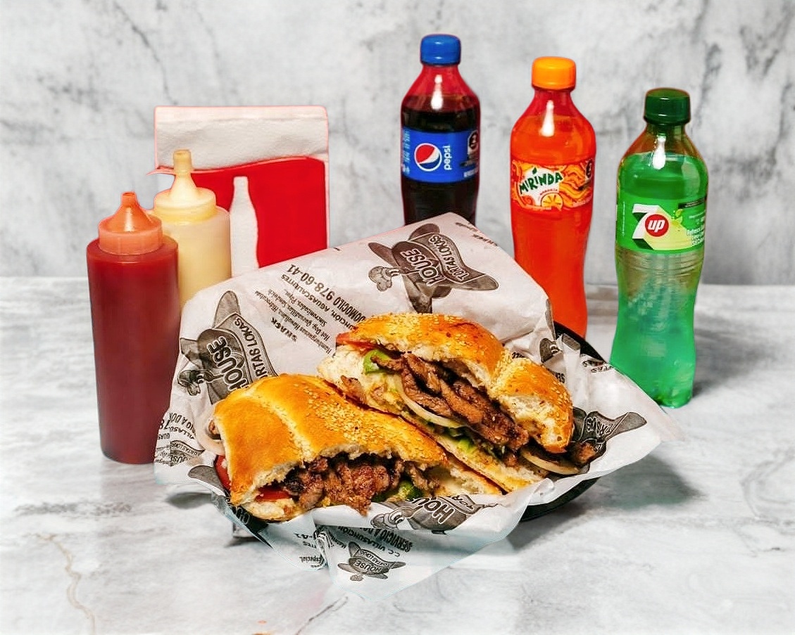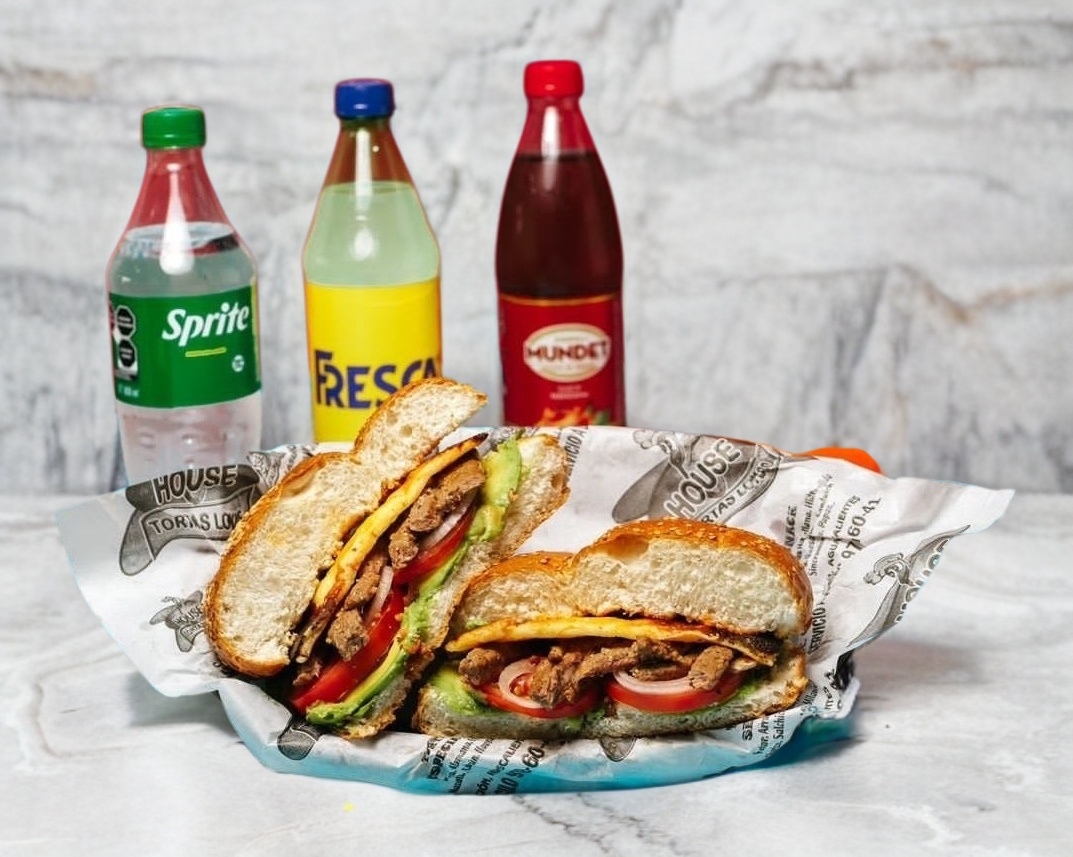 Combo personal: Torta House con pierna, milanesa, salchicha, jamón de puerco y queso asadero, acompañada de refresco de 600 ml a elección.
