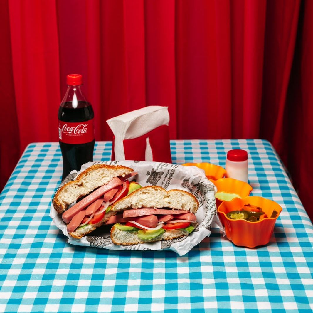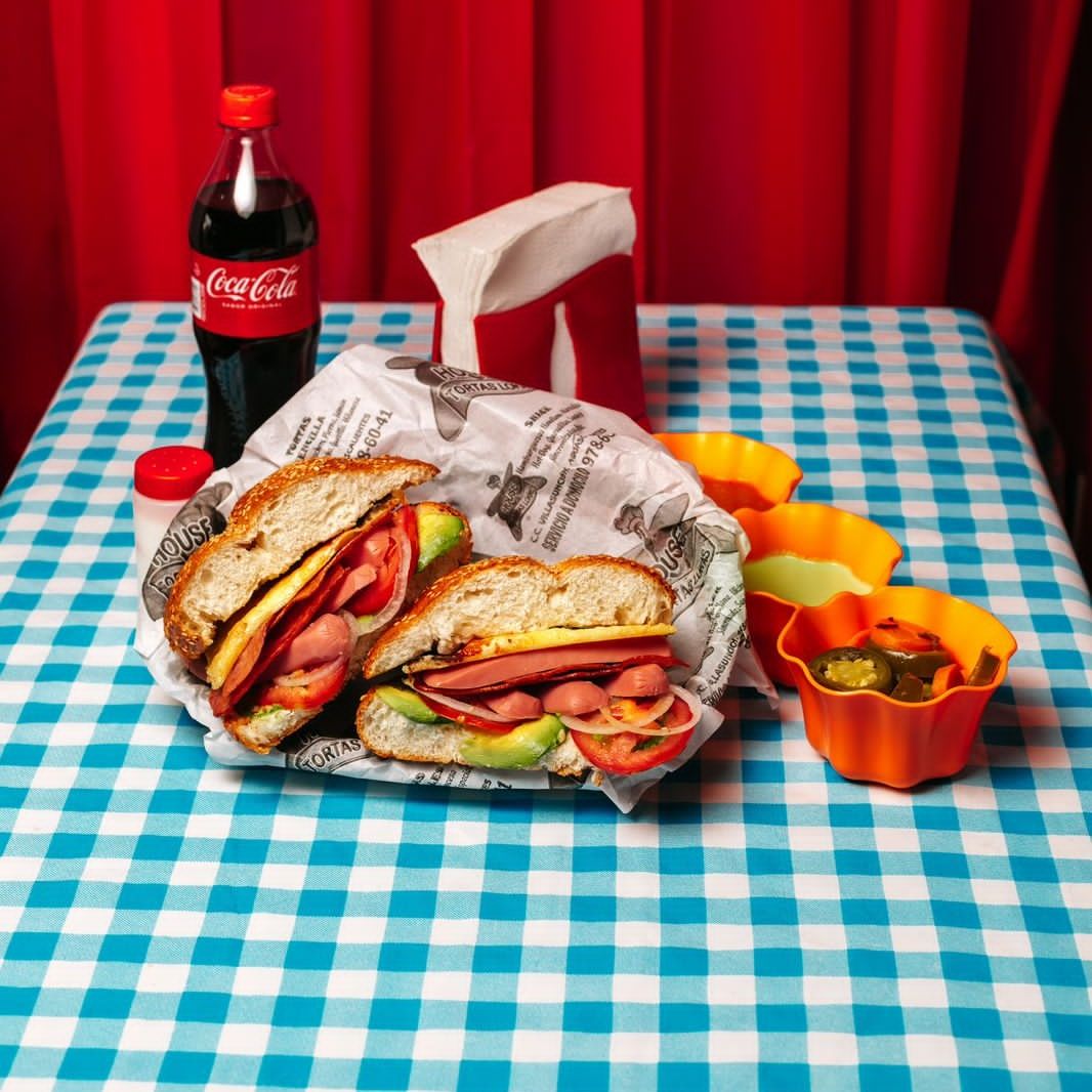 1 Torta con pierna, milanesa, salchicha, jamón y queso, acompañada de aguacate, cebolla, jitomate y mayonesa.