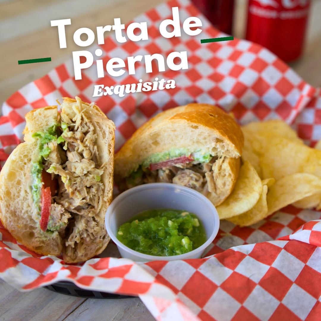1 Torta de Pierna: cama de frijoles, pierna, salsa verde de la casa, jitomate, crema y mayonesa.