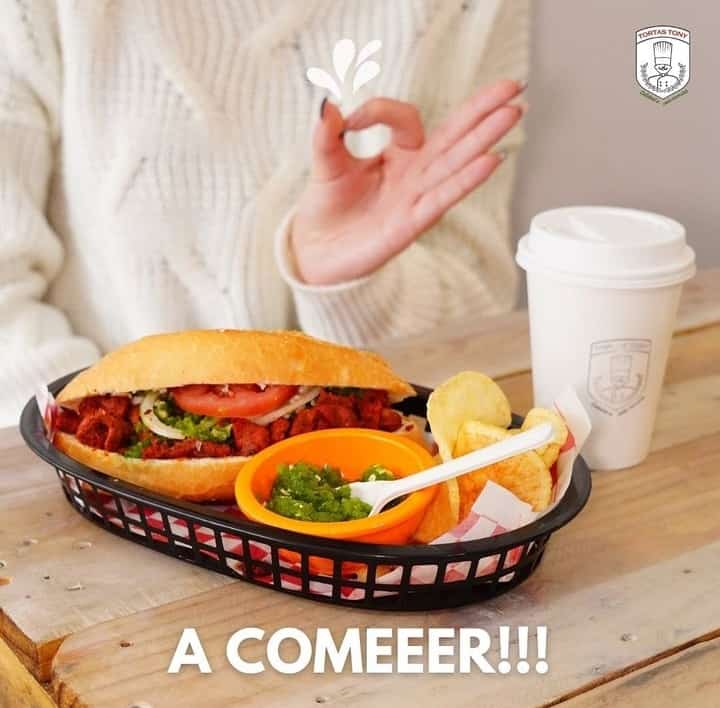 Torta de Milanesa:frijoles, milanesa, salsa verde de la casa, jitomate, crema y mayonesa.