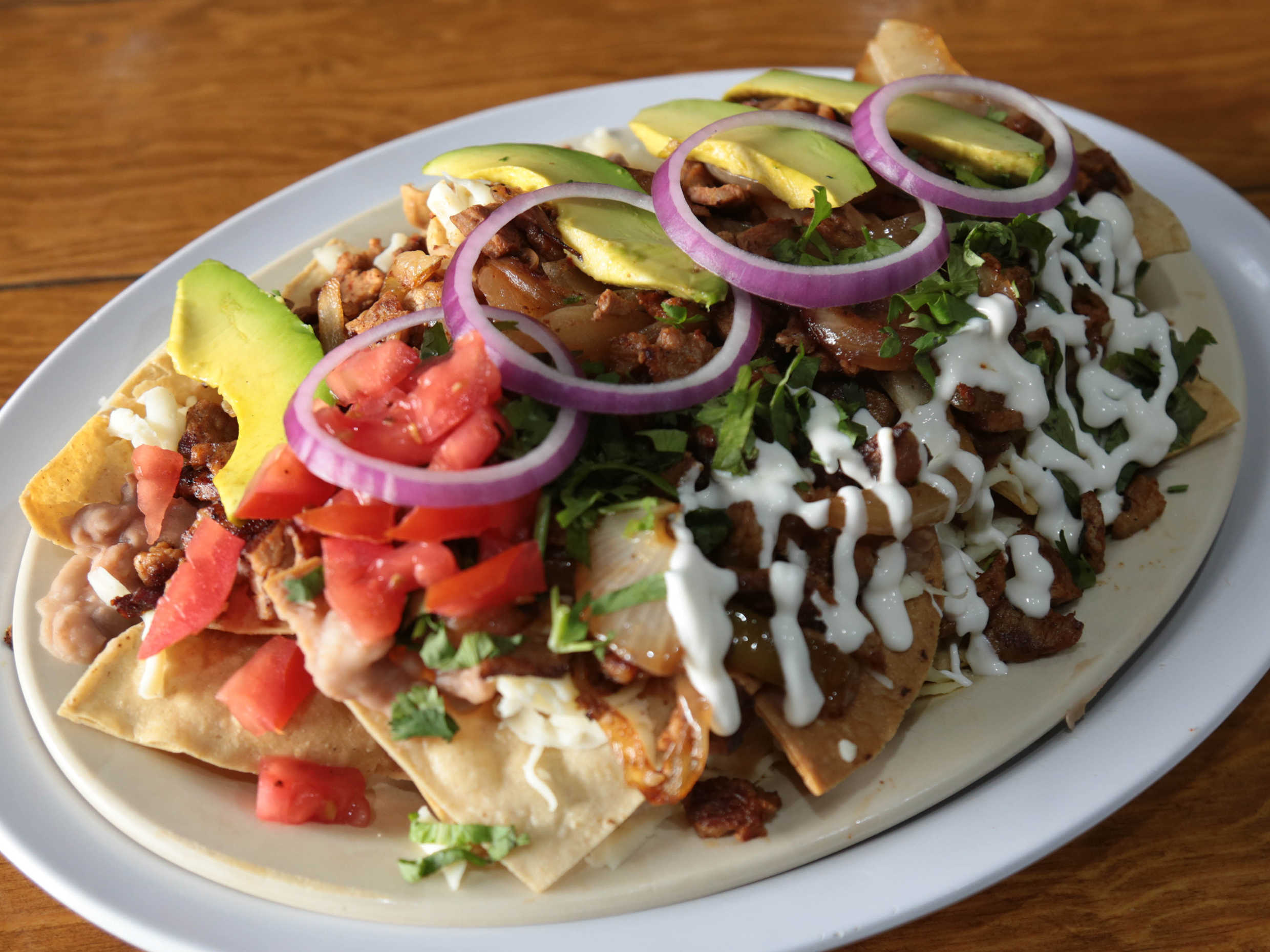 Se sirve con Totopos bañados de frijoles, queso asadero, carne cebolla frita, Aguacate, jitomate picado, cilantro, cebolla morada en rodajas y crema. te ponemos salsa y guacamole aparte también.