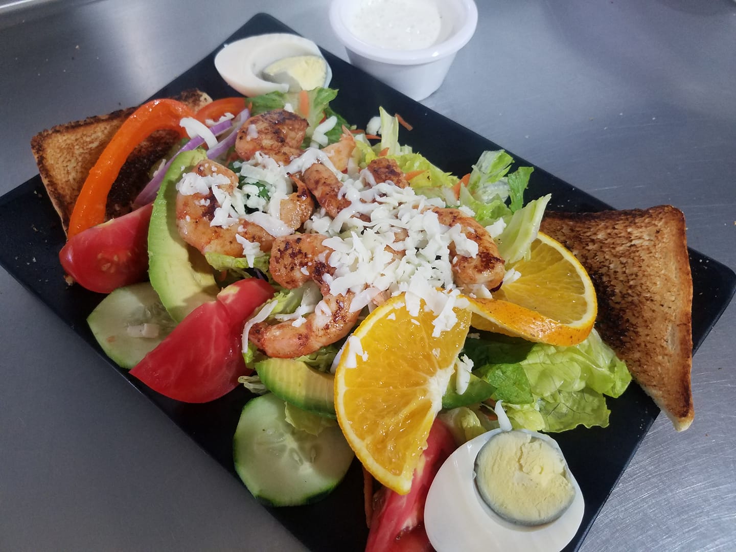 Se sirve con 10 camarones #35, lechuga romana, jitomate, morrón, cebolla morada, repollo morado, zanahoria, espinaca, pepino, aguacate, huevo cocido, queso y pan.