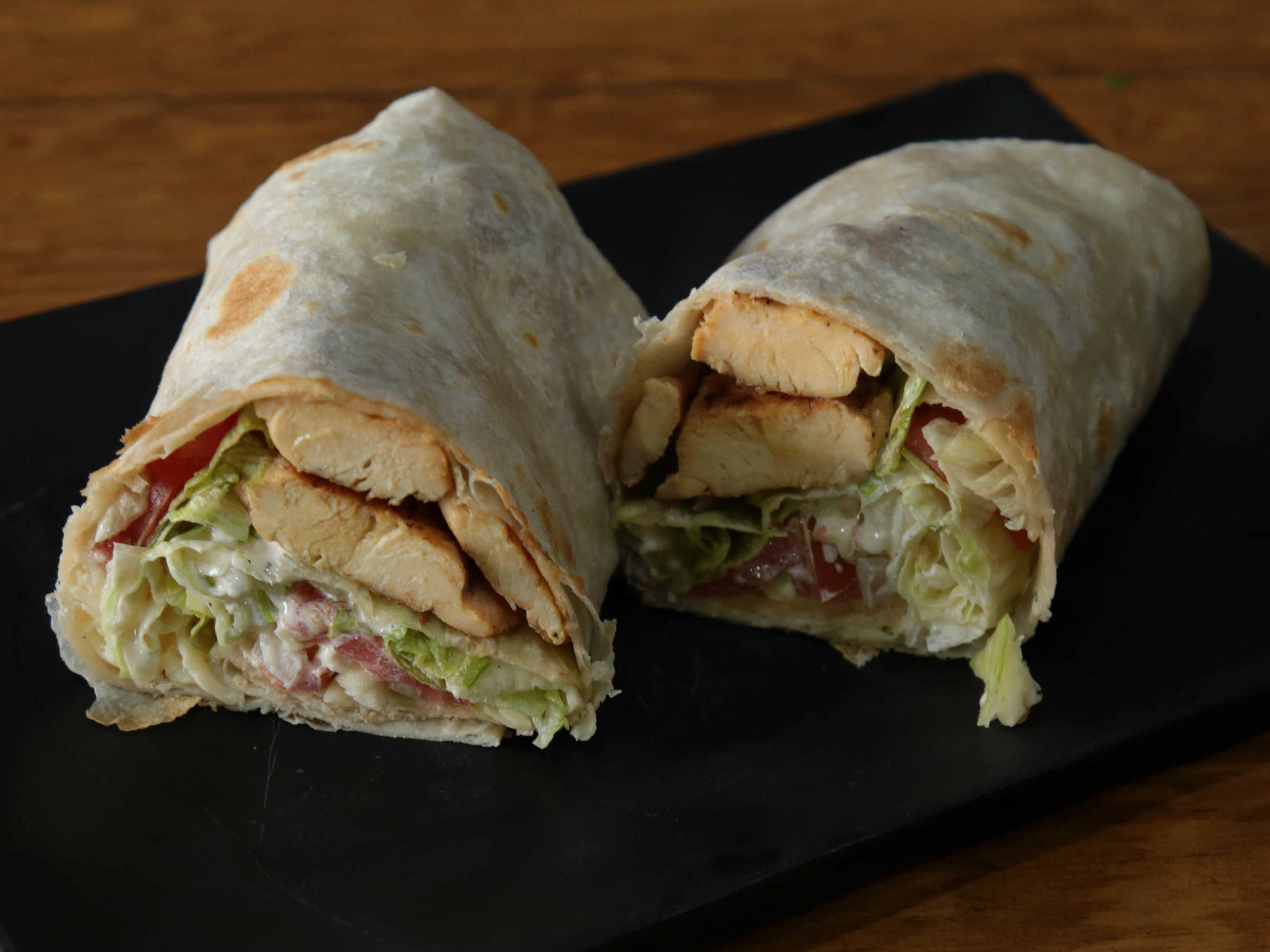 Se sirve con pollo, tocino, queso, aderezo ranch, lechuga, jitomate y cebolla en tortilla de harina de 14 pulgadas.
