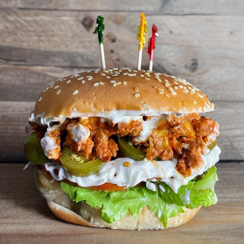 Se sirve con doble carne de res, doble queso americano, pepinillos, aderezo original mil islas, cebolla, jitomate y lechuga.