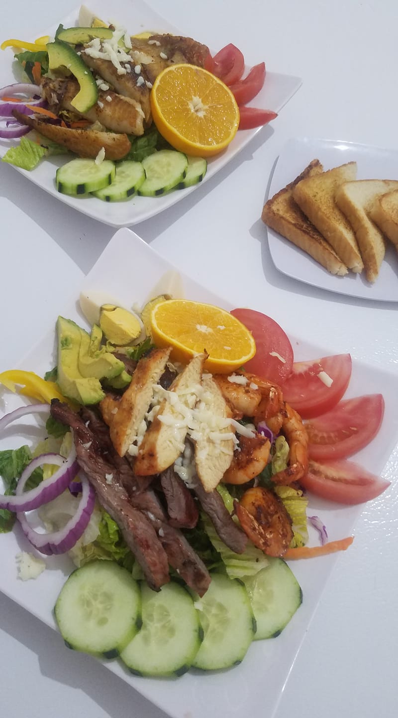 Se sirve con 6 tiras de filete de pescado tilapia, lechuga romana, jitomate, morrón, cebolla morada, repollo morado , zanahoria , espinaca, pepino, aguacate, huevo cocido, queso y pan.