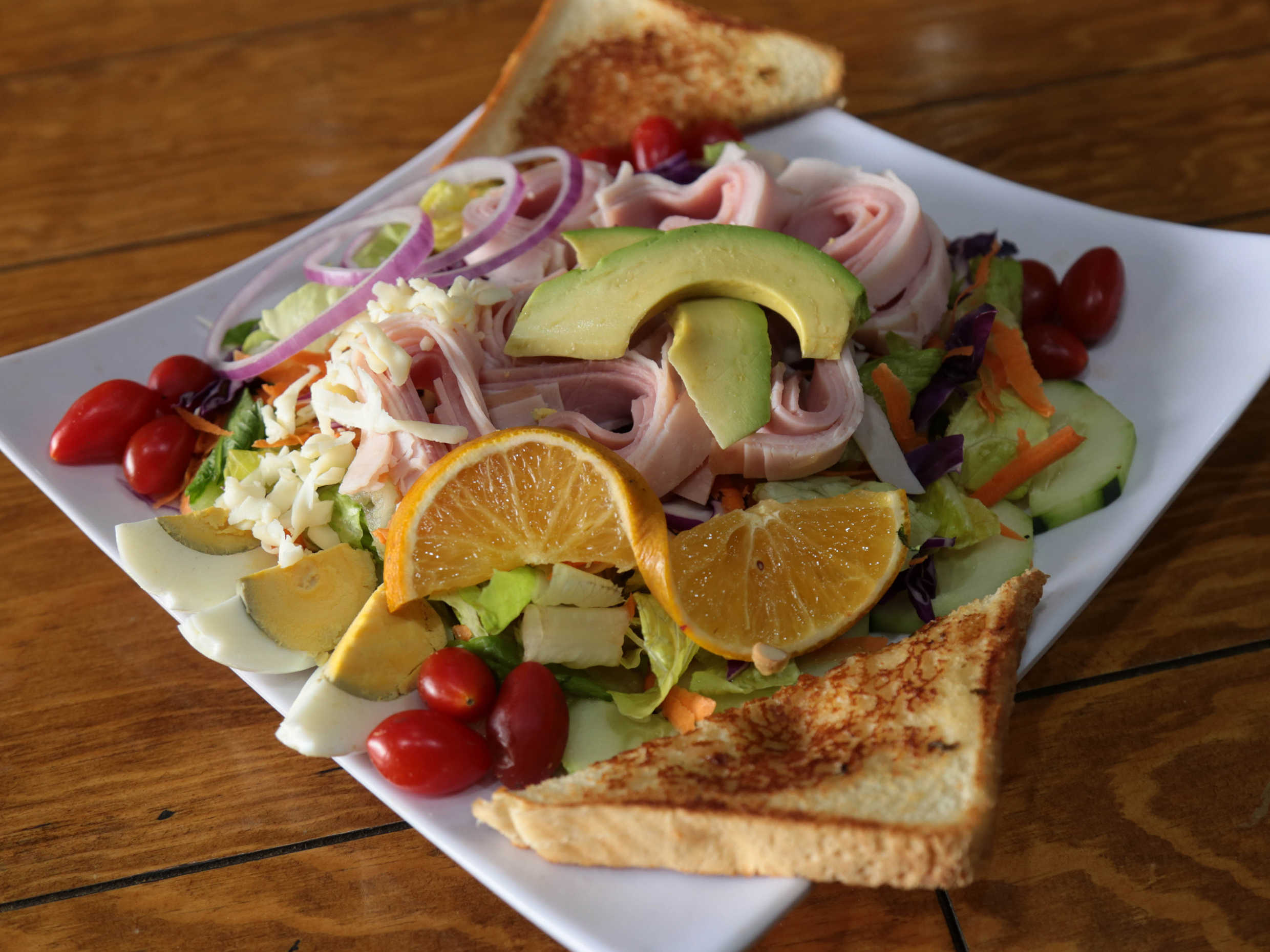 Se sirve con 200g de pechuga de pollo fresca, cocinada a la parrilla, lechuga romana, jitomate, morrón, cebolla morada, repollo morado, zanahoria , espinaca, pepino, aguacate, huevo cocido, queso y pan.