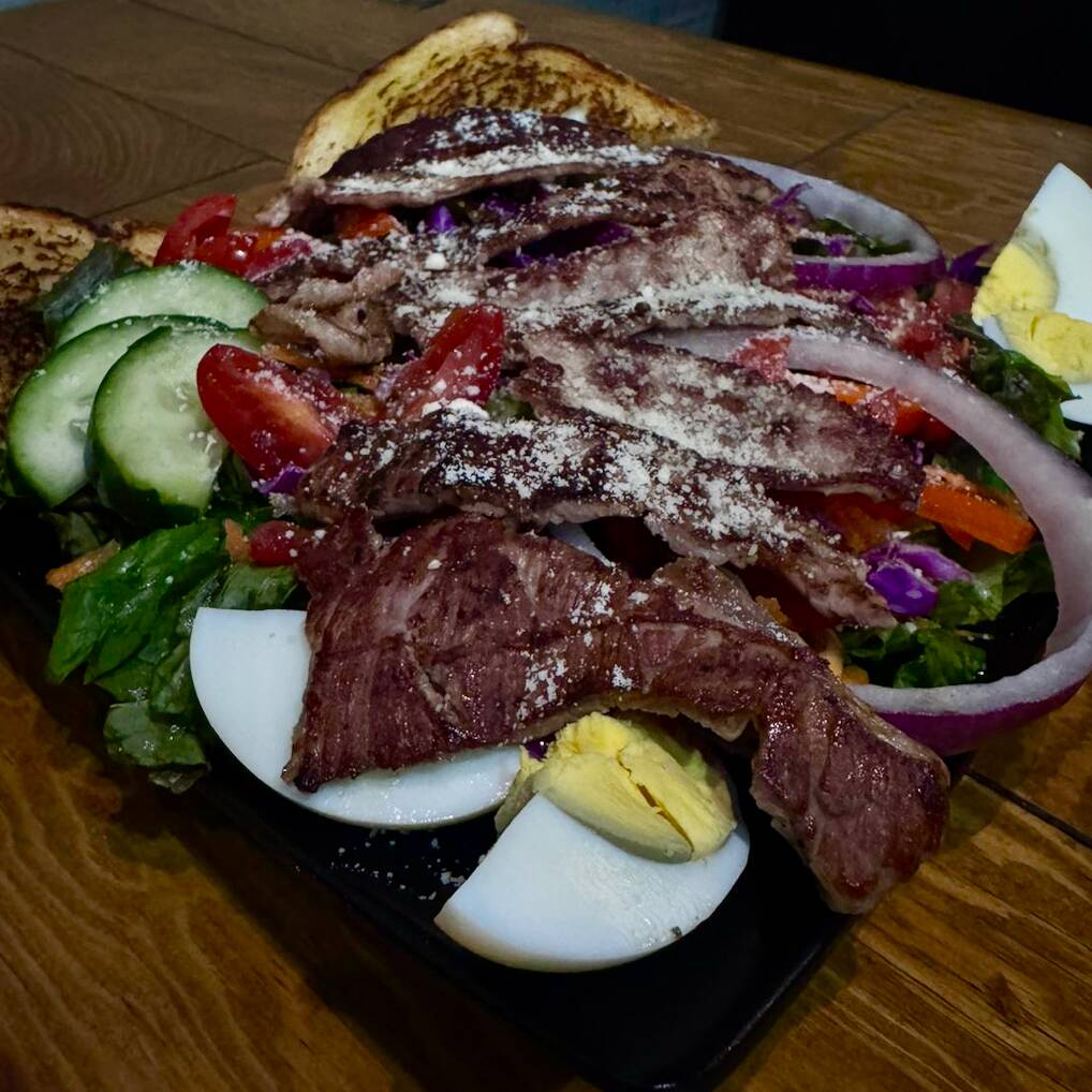 Se sirve con 210g de carne de res asada a la parrilla, lechuga romana, jitomate, morrón, cebolla morada, repollo morado , zanahoria , espinaca, pepino, aguacate, huevo cocido, queso y pan.