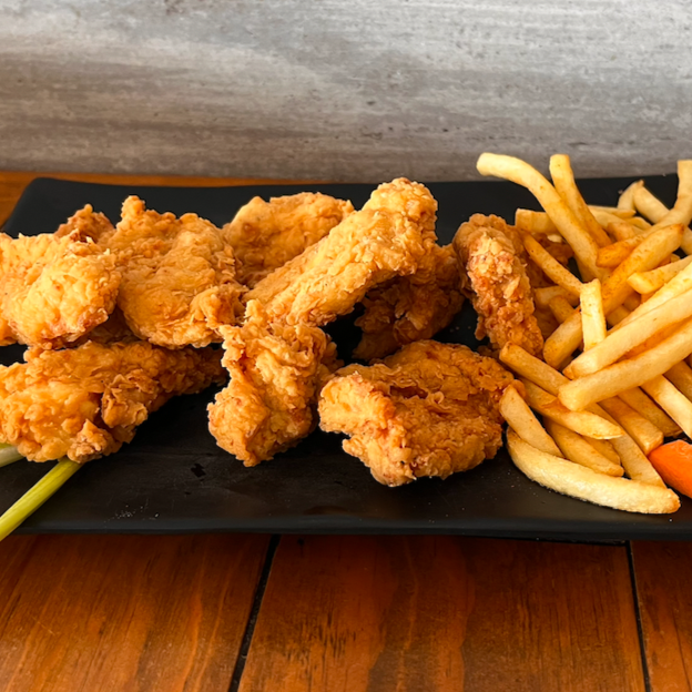 10 Alitas de pollo fritas, acompañadas de papas, aros de cebolla, ensalada y pan tostado bañadas en la salsa de tu preferencia.