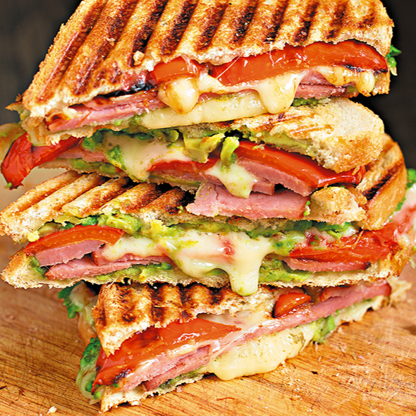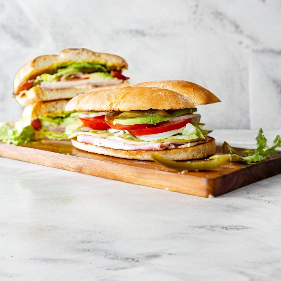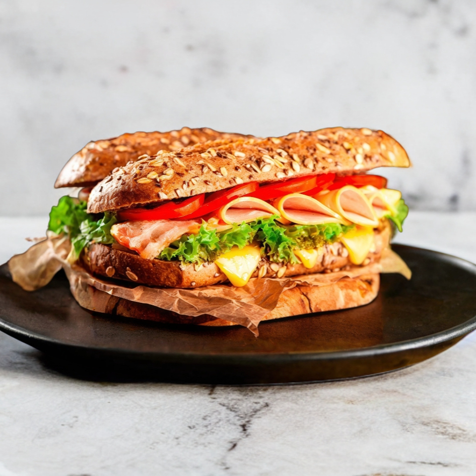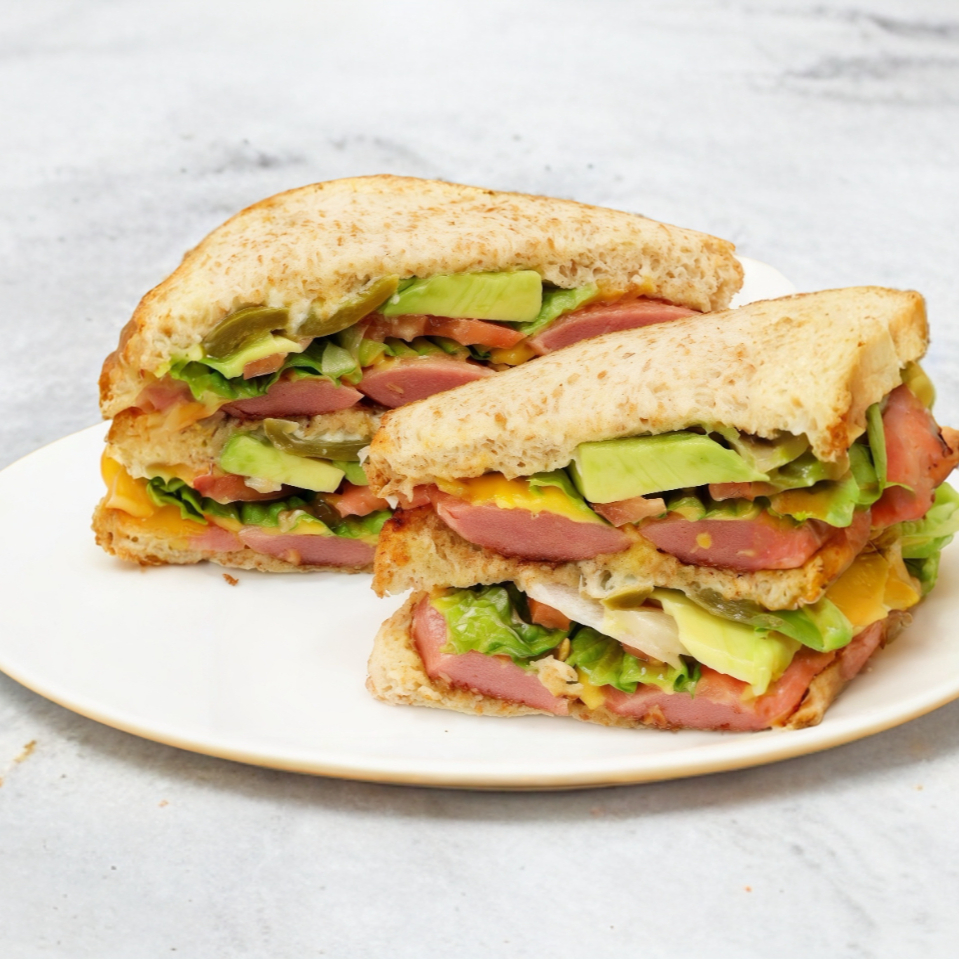 Preparado con pan alto en fibra, con mayonesa, jamón, aguacate, cebolla, jitomate, lechuga y queso