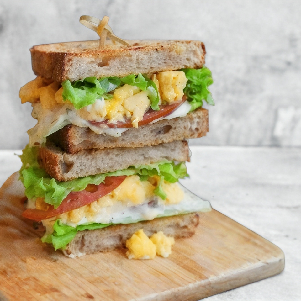 Preparado con pan alto en fibra, con mayonesa, huevo, aguacate, jitomate, lechuga, cebolla y queso