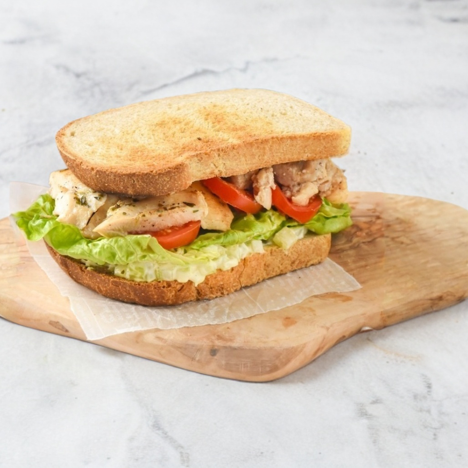 Preparado con pan alto en fibra, pollo a la plancha, aguacate, cebolla, jitomate, lechuga y queso