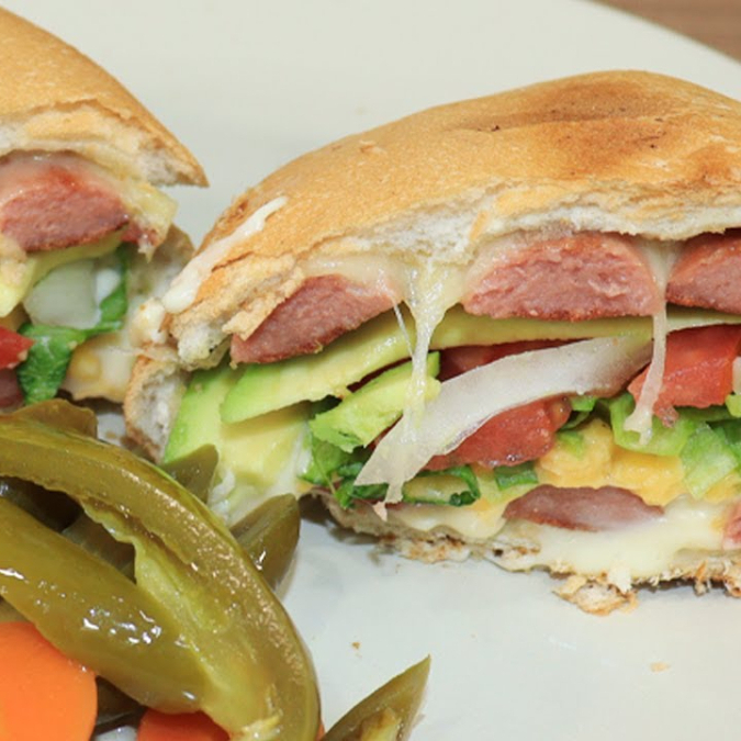 Preparado con pan alto en fibra, con mayonesa, salchichas, aguacate, cebolla, jitomate, lechuga y queso