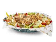 Pechuga de pollo al grill, cebolla, tomate, lechuga y queso. 150 g pechuga de pollo 220 g de papa
