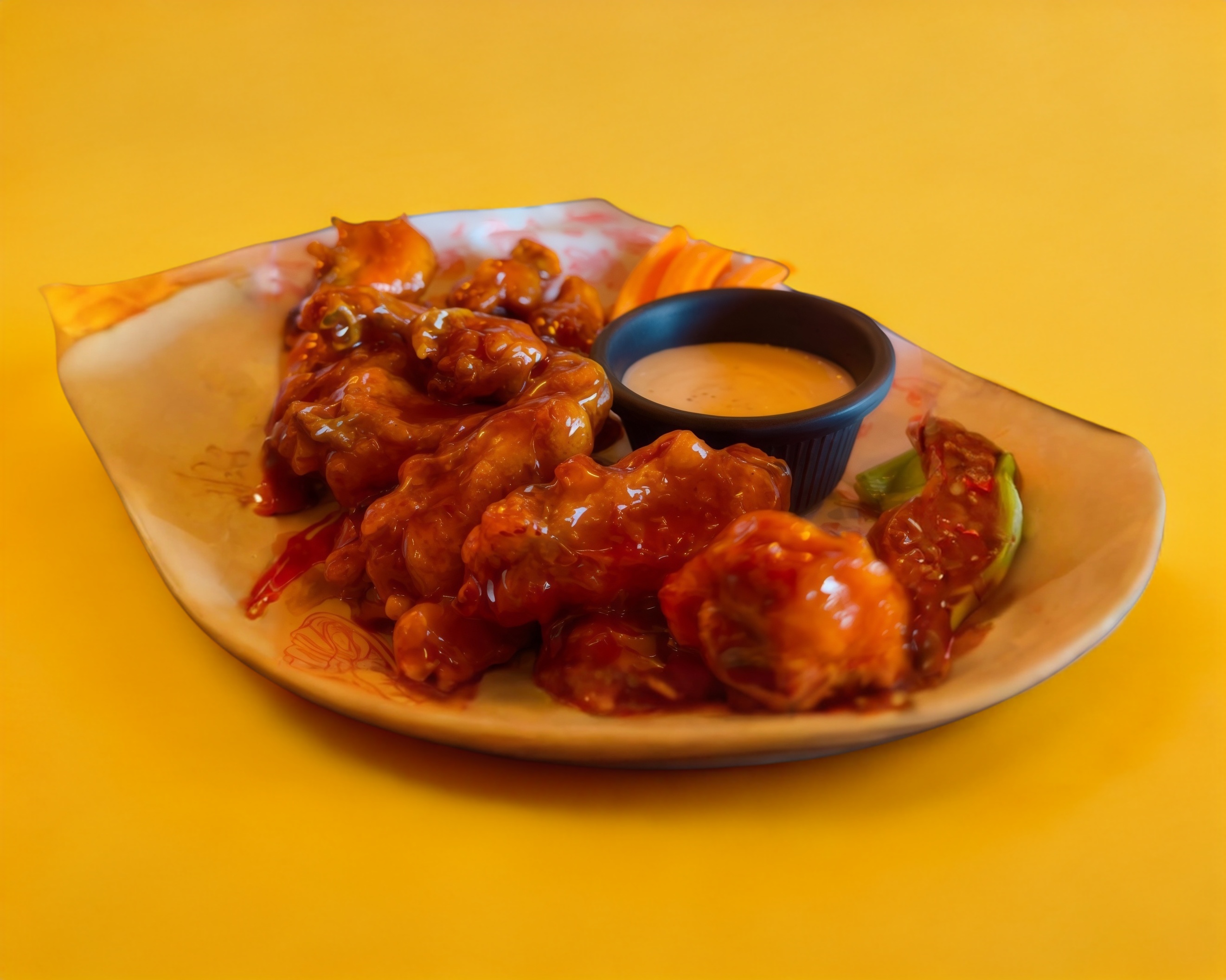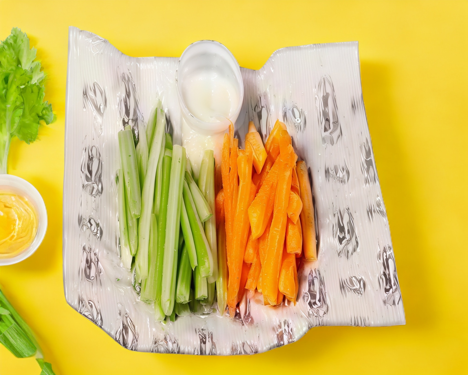 Bastones de apio y zanahoria acompañados con aderezo ranch.
