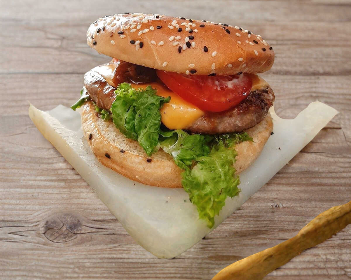 50 g De carne de res, lechuga, jitomate y cebolla caramelizada.