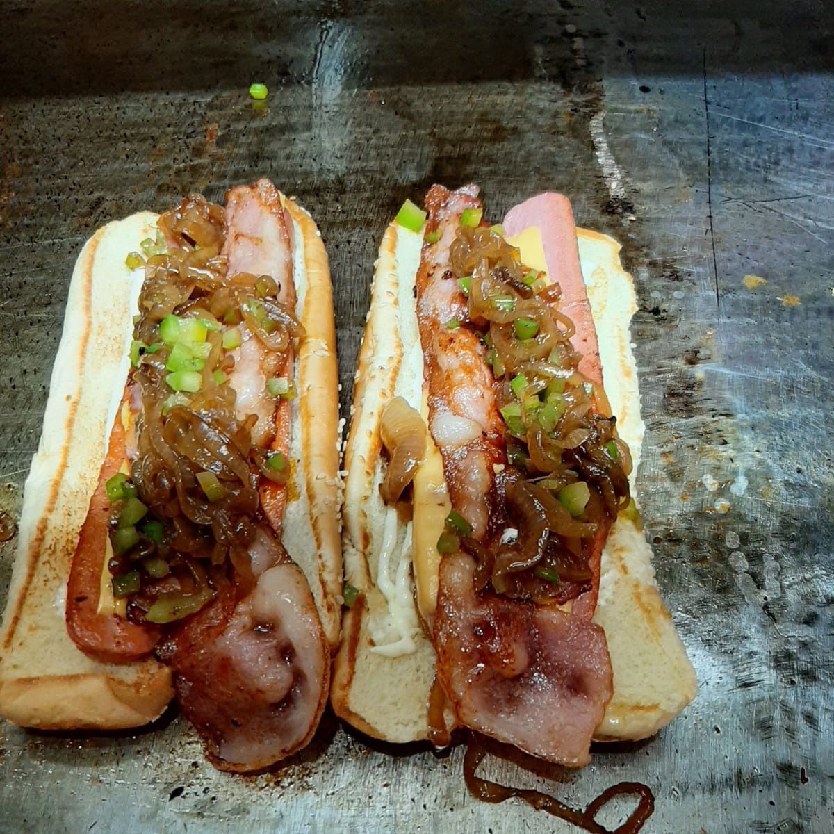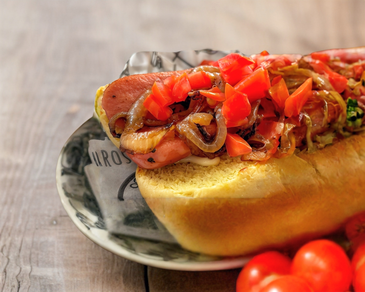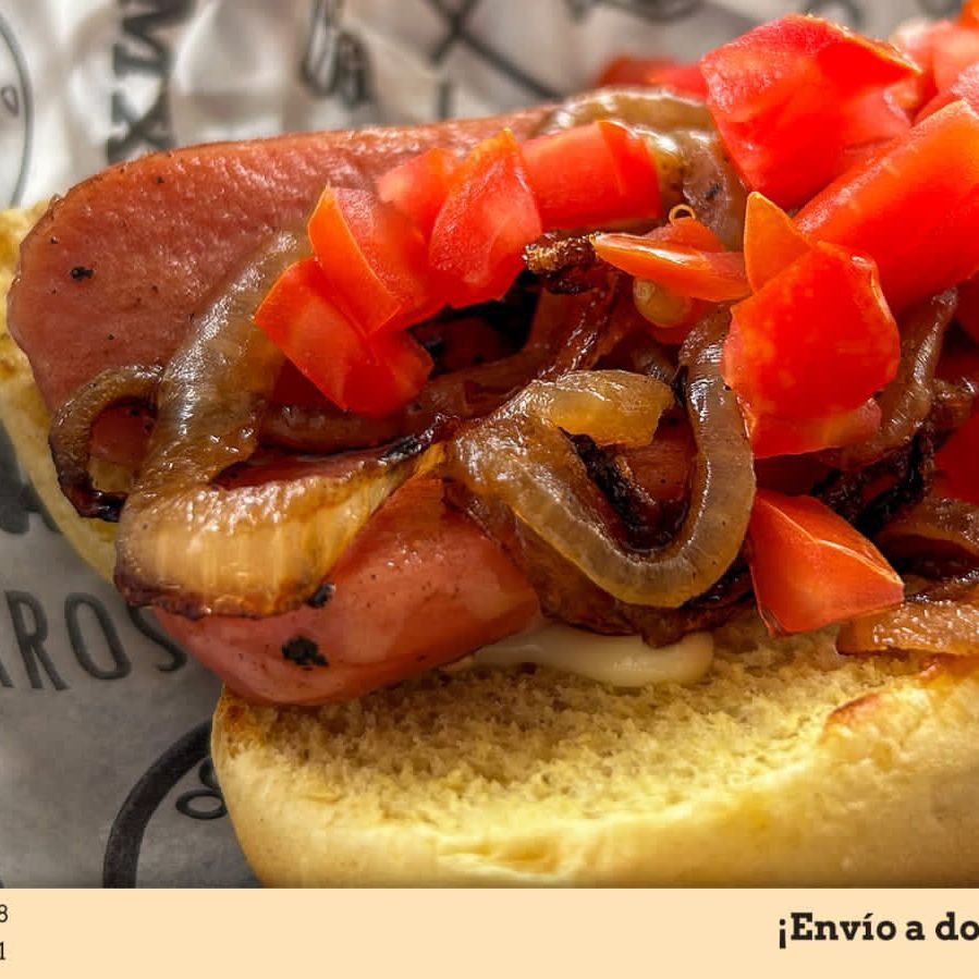 Salchicha jumbo, tocino, queso americano, pimientos, jitomate y cebolla morada.