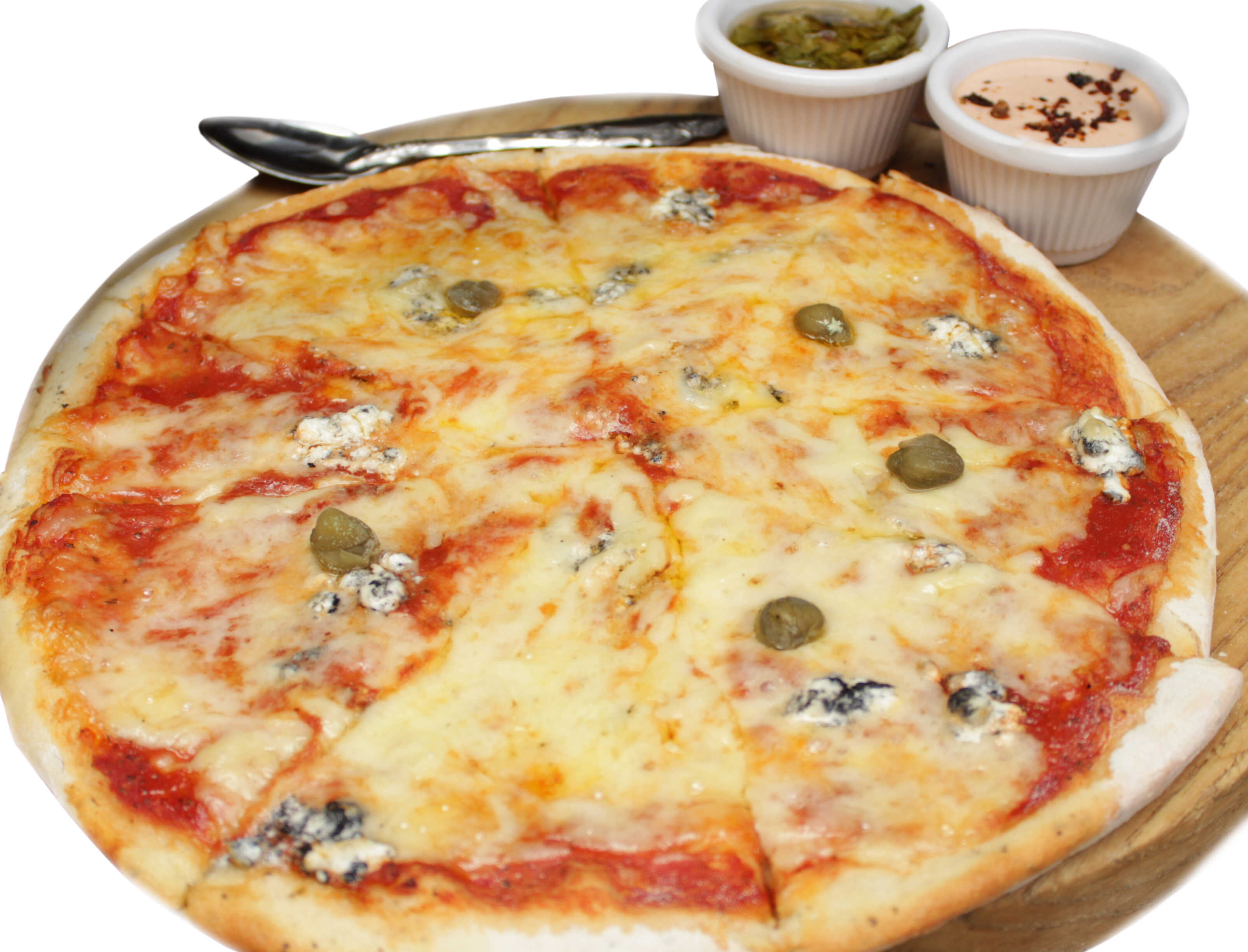 Combinación de queso mozzarella, manchego y Chihuahua, queso de cabra y parmesano con un toque de alcaparras.