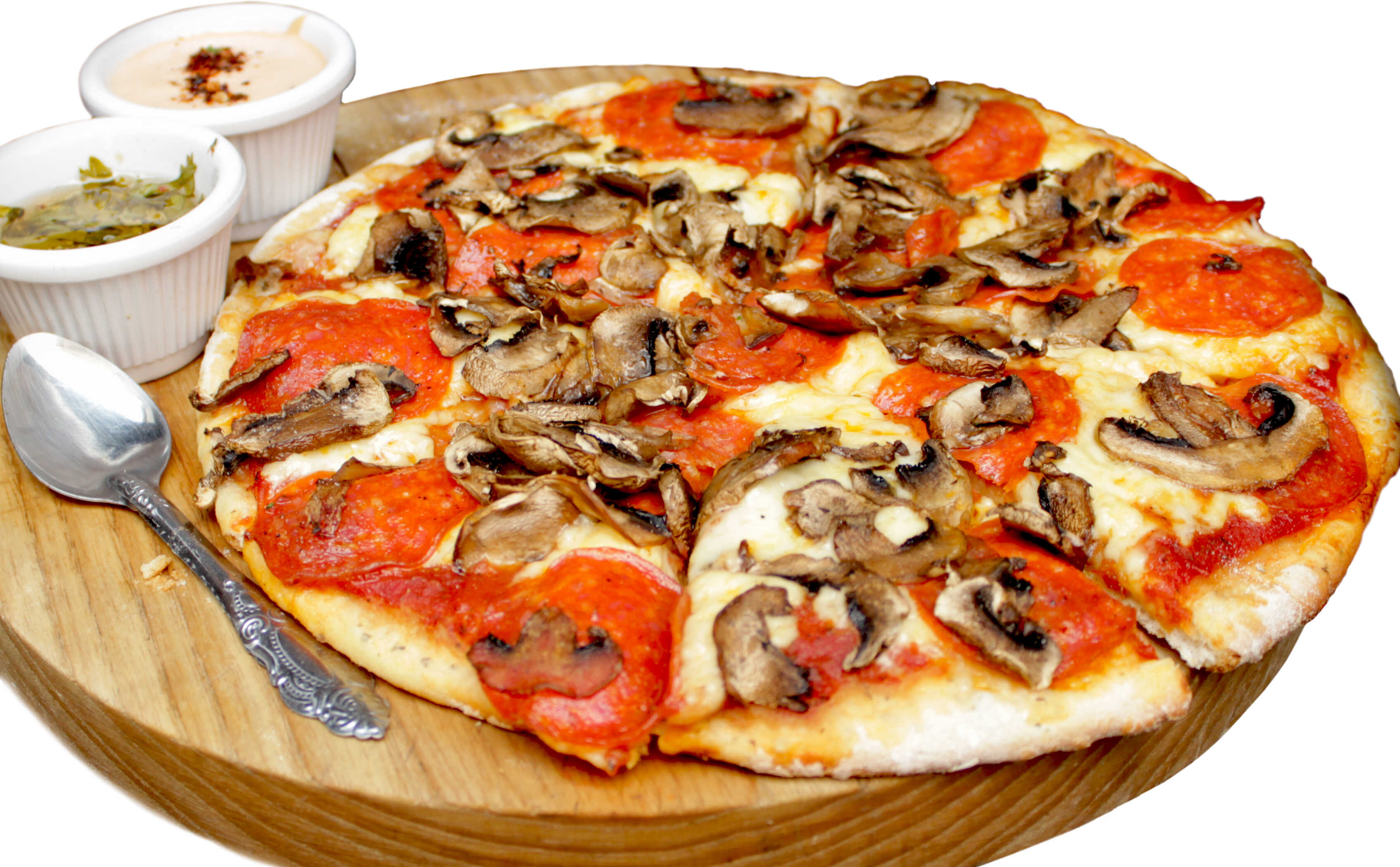 Combinación de queso mozzarella, manchego y Chihuahua, champiñones frescos y elige entre rebanadas de jamón de pavo o rebanadas de pepperoni. 450 gramos.