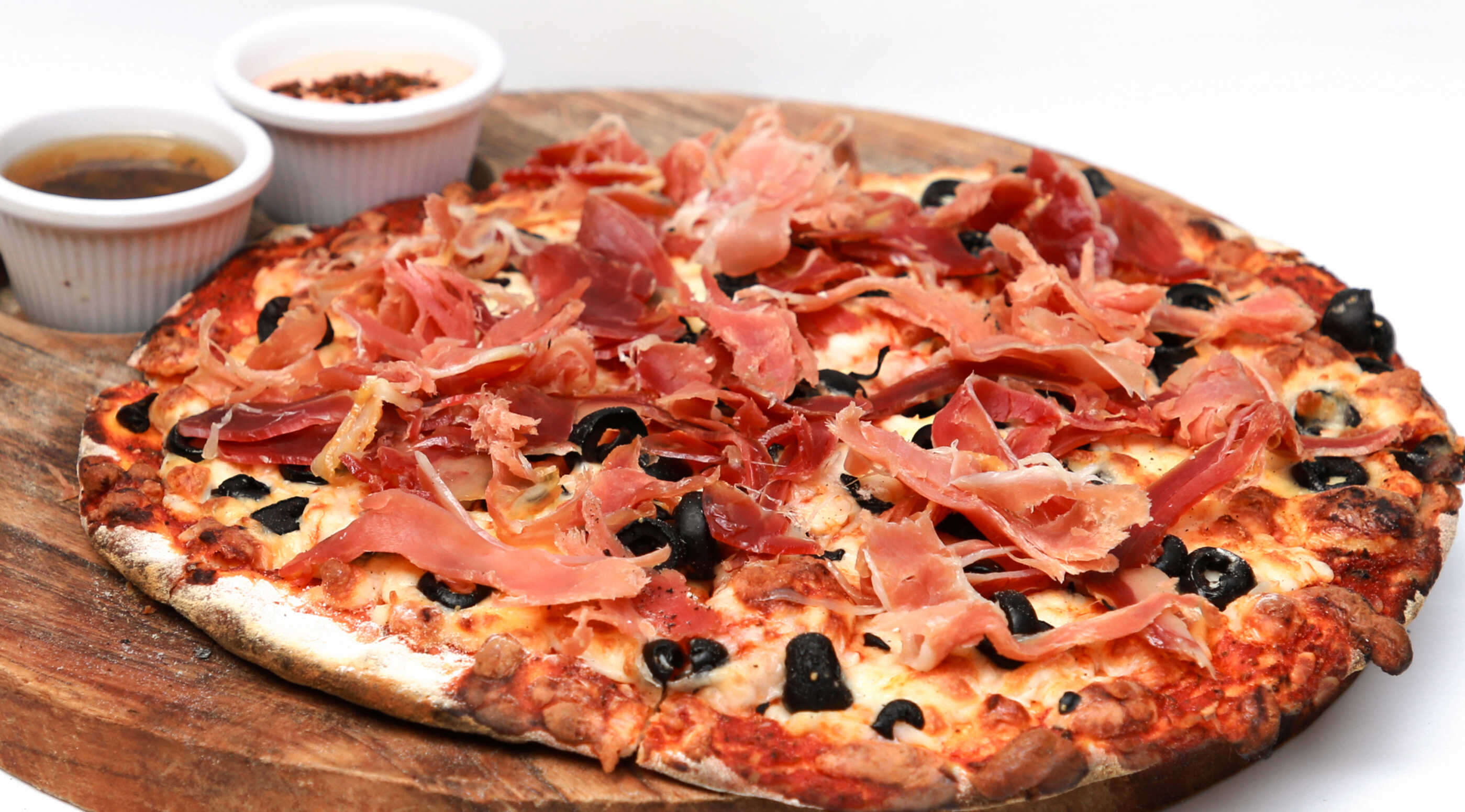 100gr de Jamón de Pierna a la parrilla con queso manchego gratinado, aceitunas negras, pimiento morrón, pepperoni, jamón selva negra, lechuga y tomate.