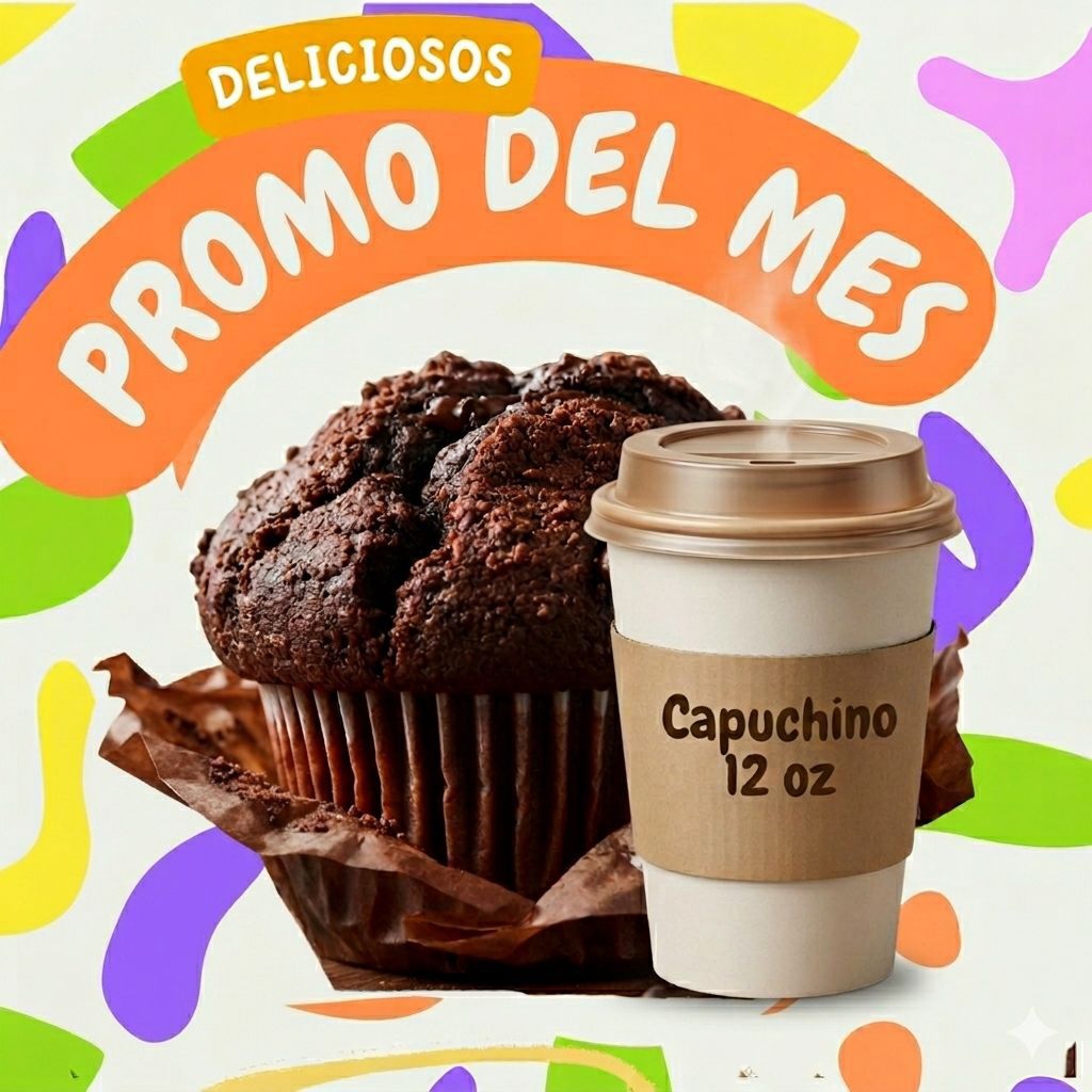 Promo del Mes! Capuchino frio o caliente de 12 oz acompañado de un riquísimo Muffin de chocolate