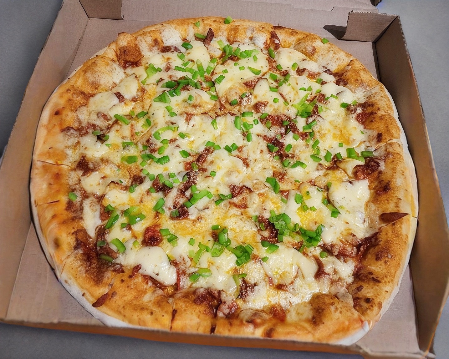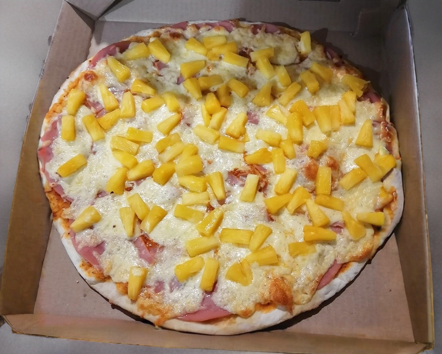 Jamón, piña, queso y papas.