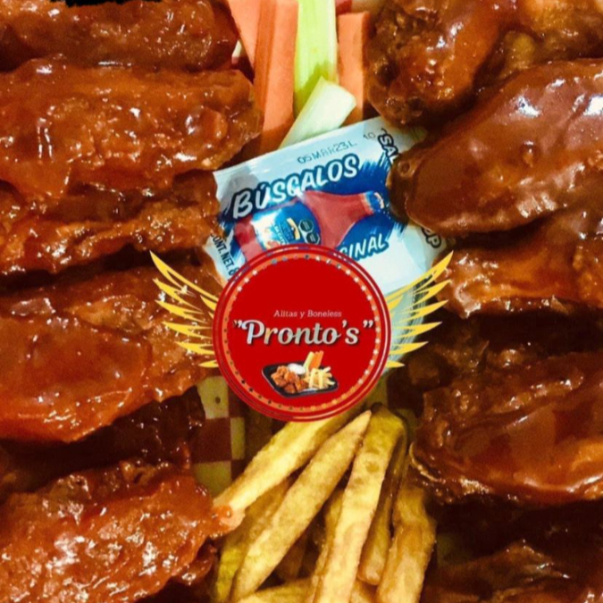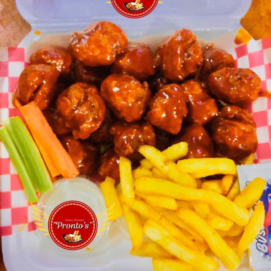 Orden de 20 piezas de pechuga de pollo sin hueso, empanizados y bañados de salsa a elegir, acompañados de aderezo ranch y papas a la francesa.