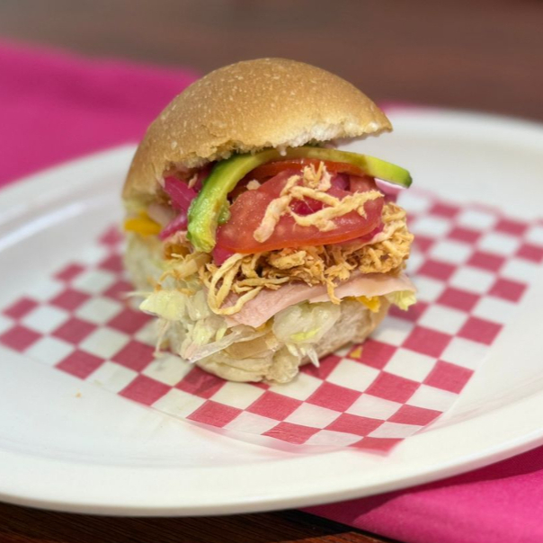 Pan de gloria dulce, pavo, jamón, lechuga, tomate, aguacate, cebolla curtida y queso daisy.