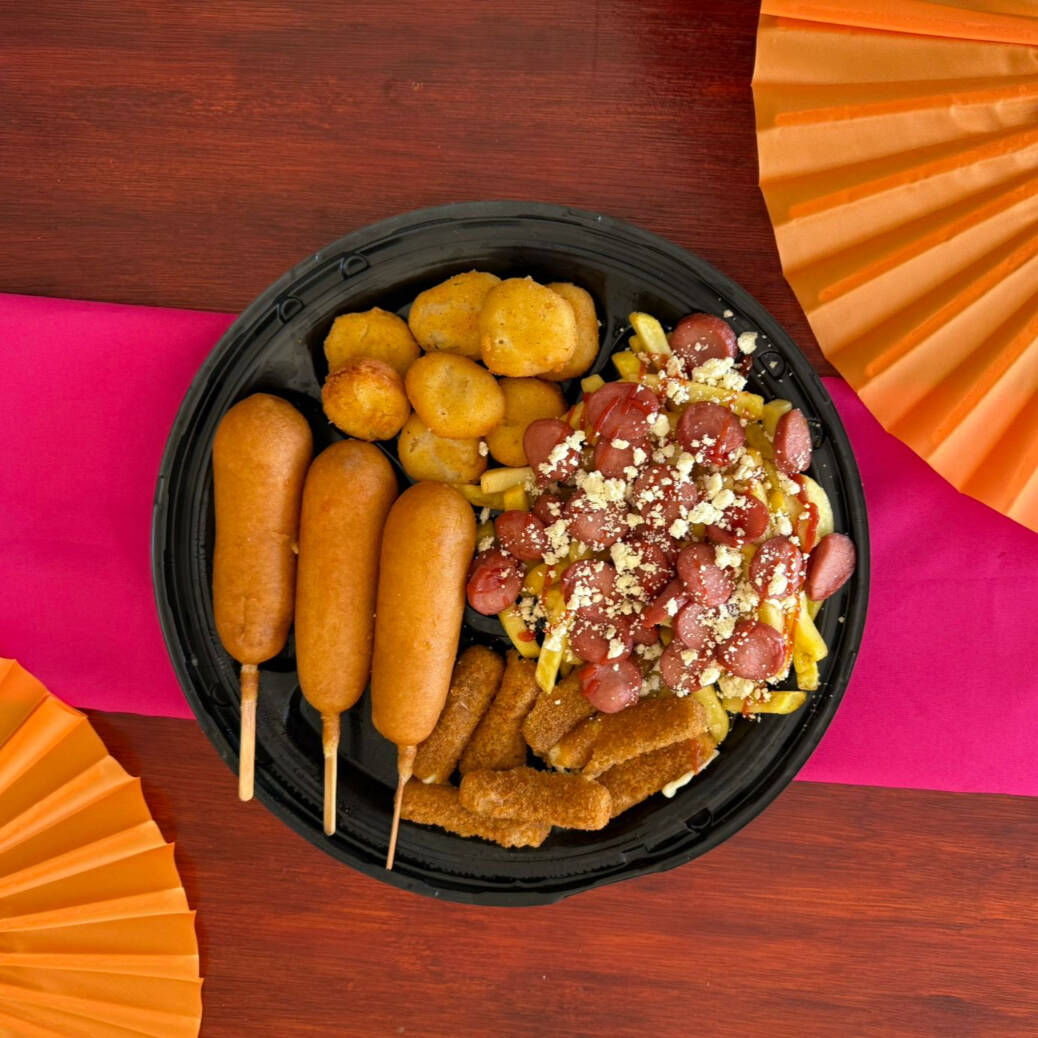 3 banderillas, salchipapas, 8 nuggets y 7 palitos de mozzarella.