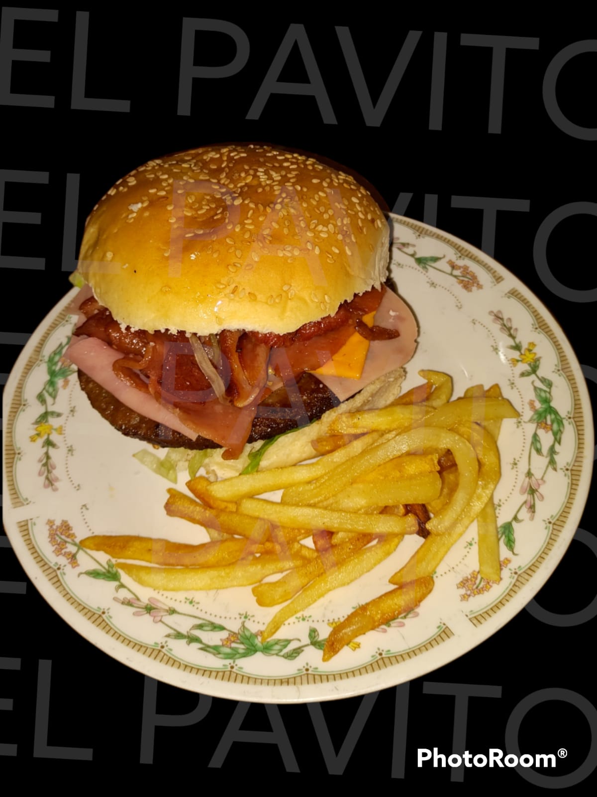 Aderezo, lechuga romana, 150 gr de carne, queso manchego, jamón, tocino, salchicha para asar kir, cebolla frita y papas a la francesa.