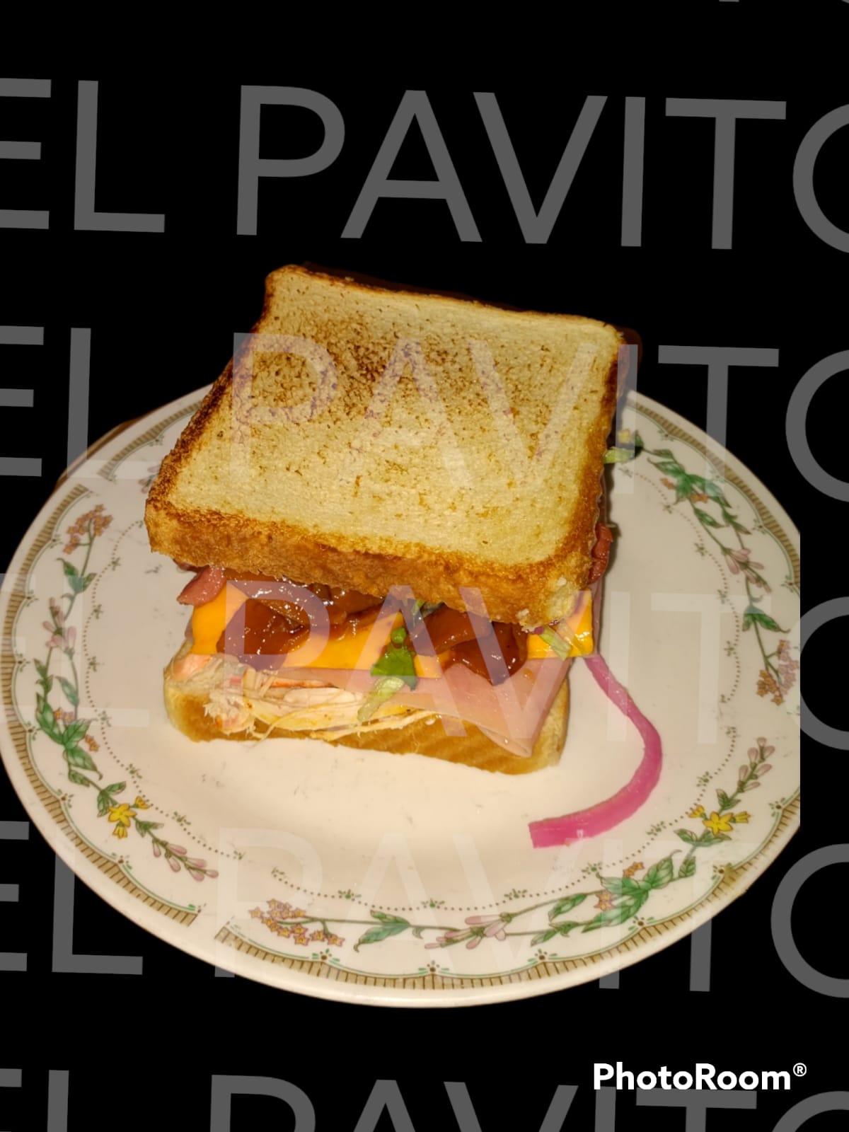 Aderezo, pavo, jamón, queso daysi, salchicha, jamón claveteado, lechuga y cebolla.