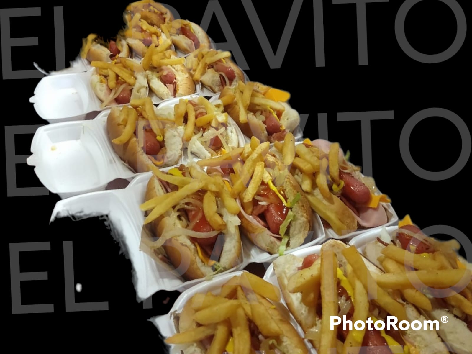 Aderezo, salchicha, tocino, jamón, lechuga, cebolla, queso y una pequeña porción de papas.
