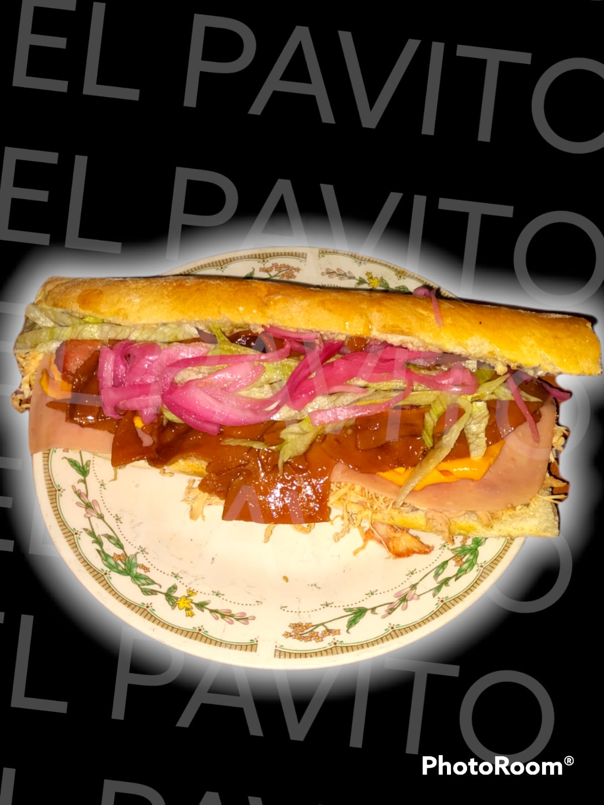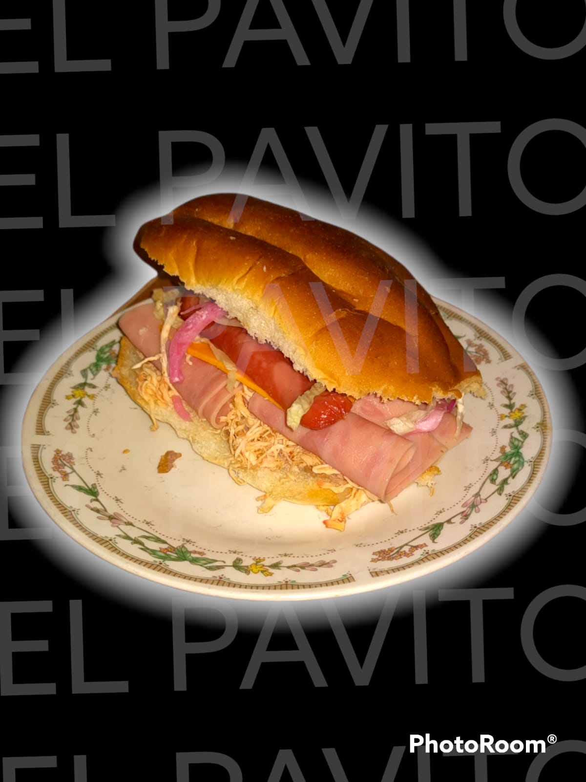 Aderezo, pavo, jamón, queso deysi, salchicha, jamón claveteado, lechuga y cebolla.