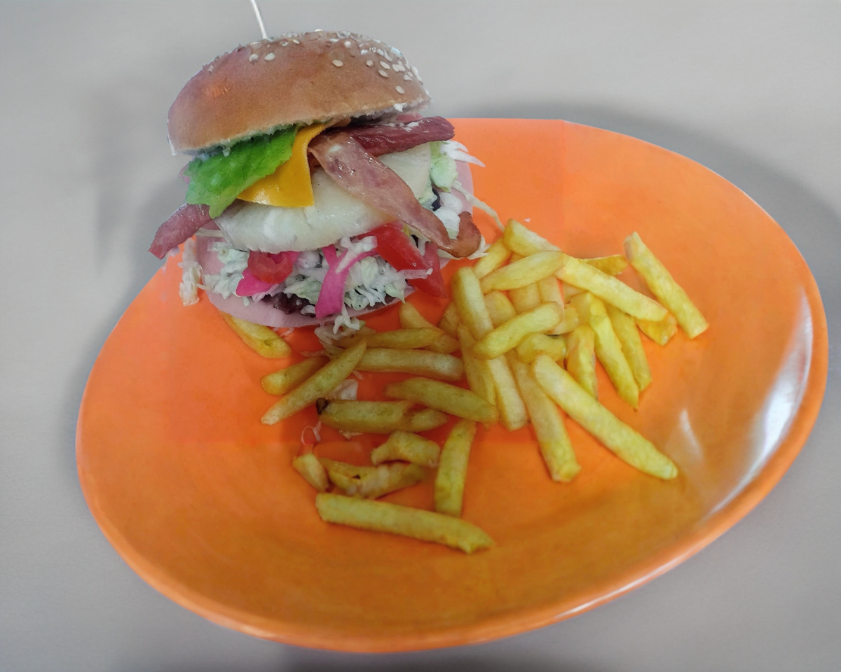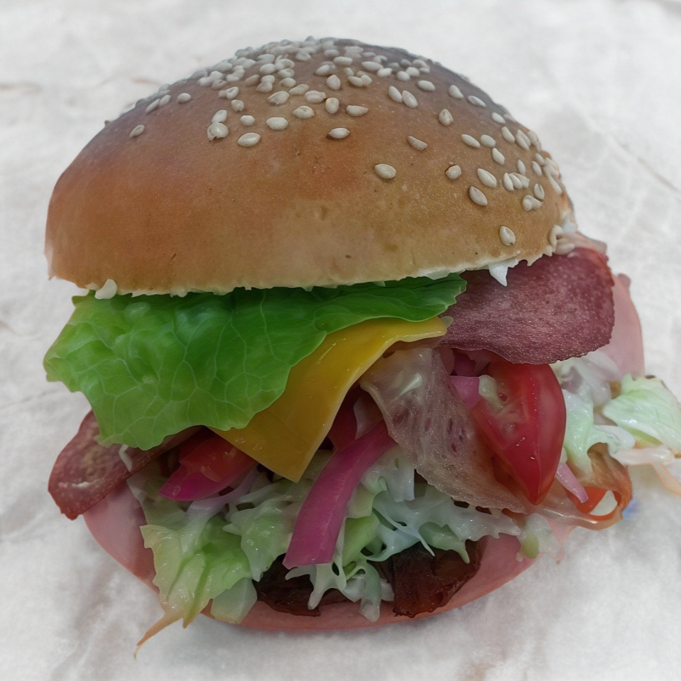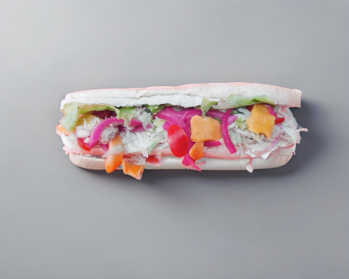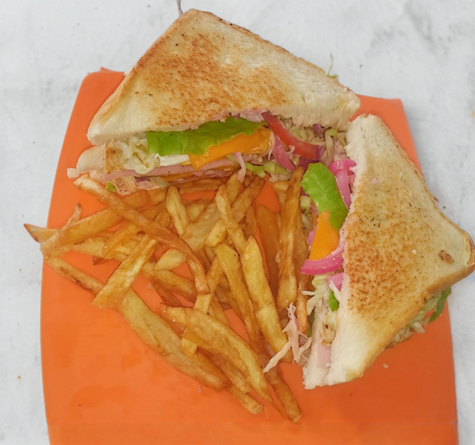 Pollo, jamón, salchicha, tocino, queso Daysi y vegetales.