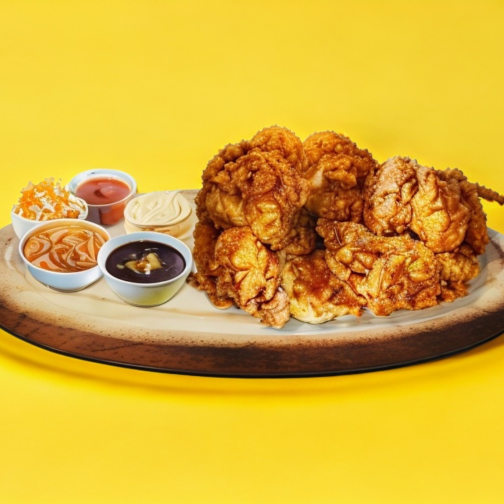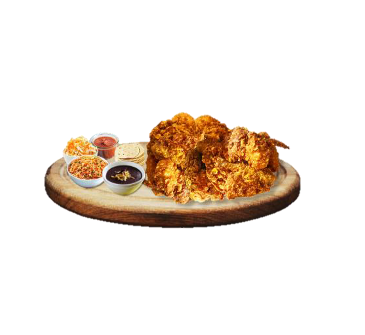 1 Pollo entero crují con Arroz, Frijol, Salsa de tomate, Ensalada y Tortillas.