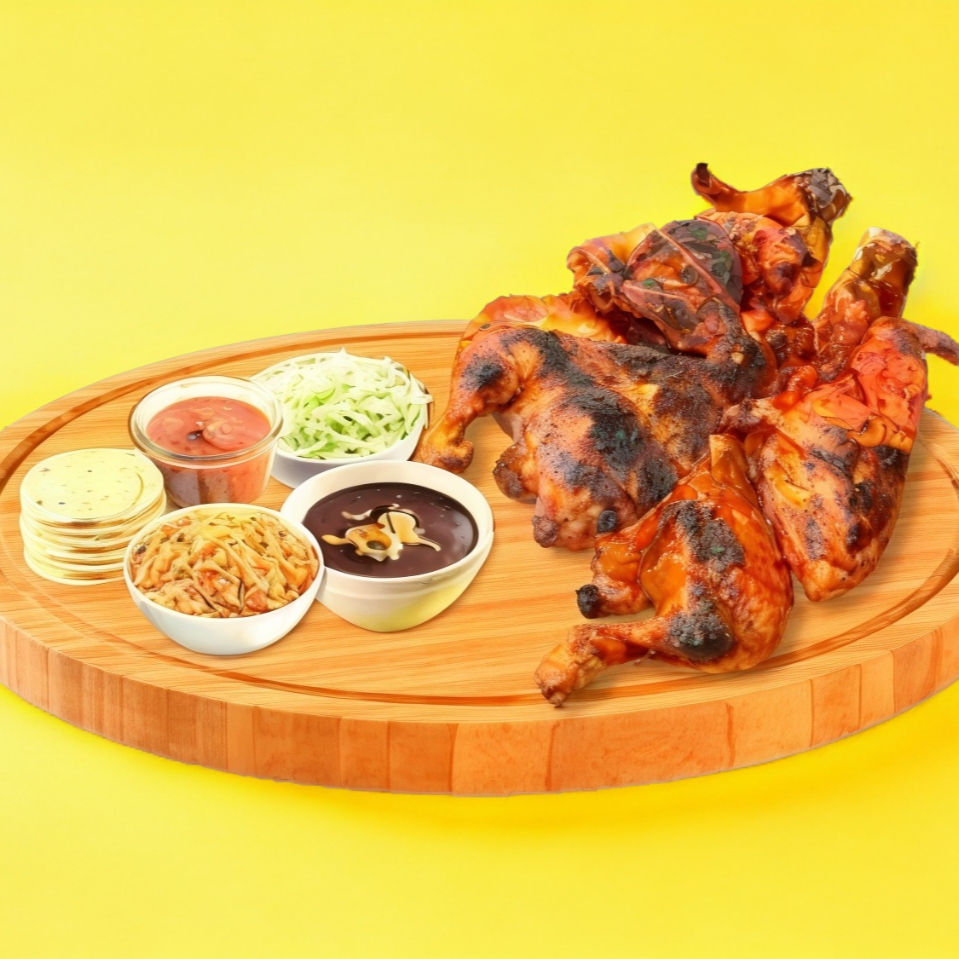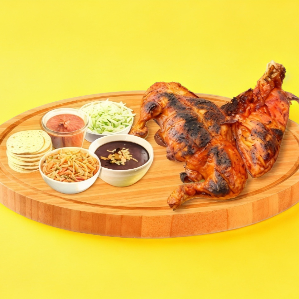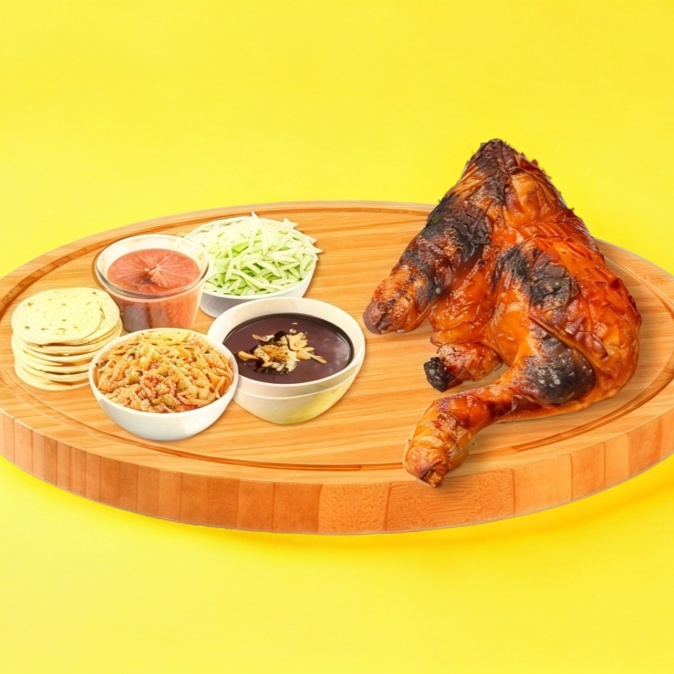 3/4 Pollo asado con Arroz, Frijol, Salsa de tomate, Salsa de repollo y Tortillas.