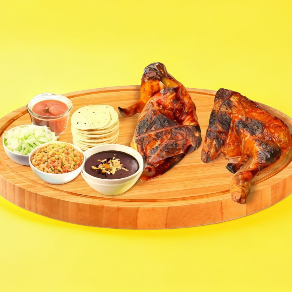 1/2 Pollo asado con Arroz, Frijol, Salsa de tomate, Salsa de repollo y Tortillas.