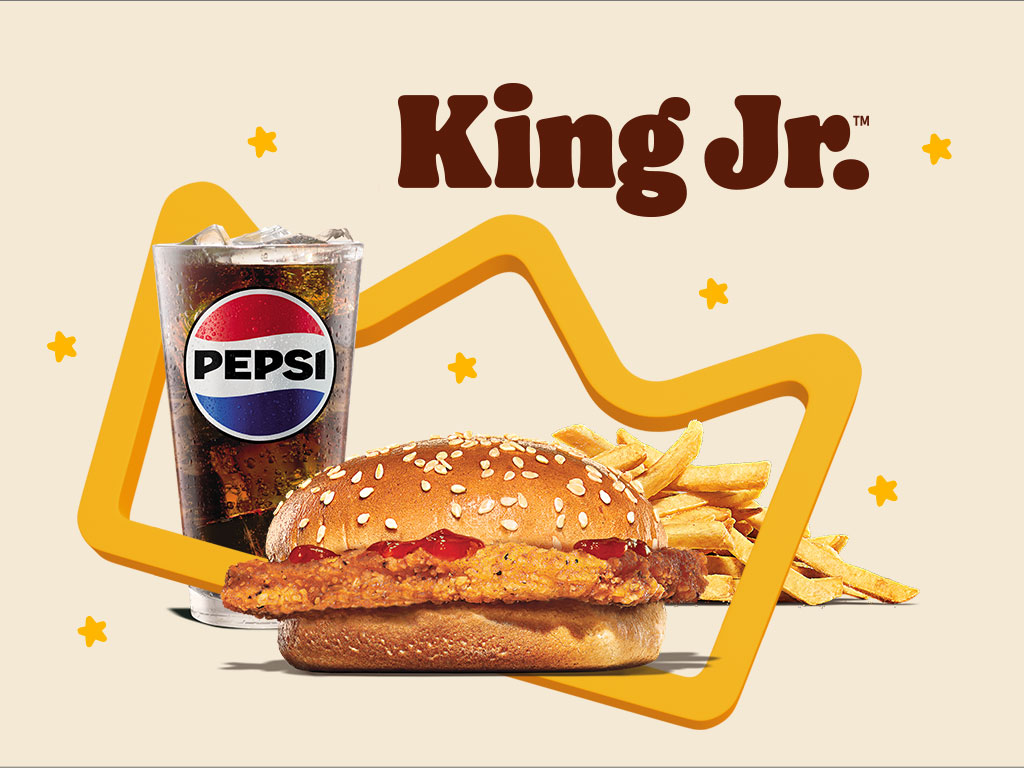 Para los mini reyes: Hamburguesa con filete de pollo empanizado y salsa ketchup sobre un pan suave con ajonjolí, acompañada de papas kids, una bebida y un juguete sorpresa.