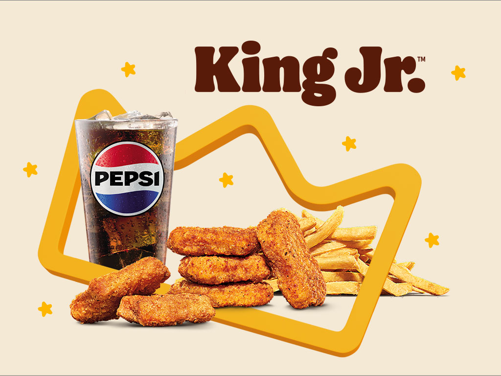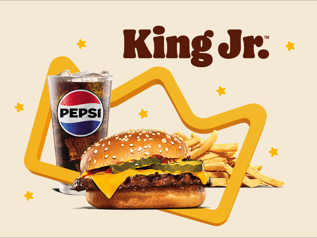 El antojo que todo Rey necesita. Elige entre hamburguesa con queso o 6 nuggets + papas chicas.