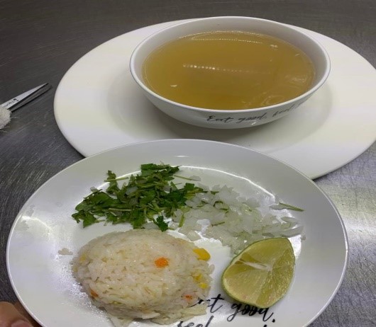 consome de pollo (16oz), con arroz, guarnición de cebolla, cilantro.