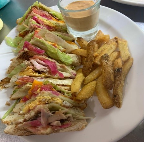 Delicioso sándwich de 4 capaz (10cm aproximados) contiene huevo, pollo asado, jamón queso, ensalada fresca, guarnición de papas fritas (100gr).