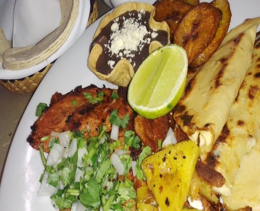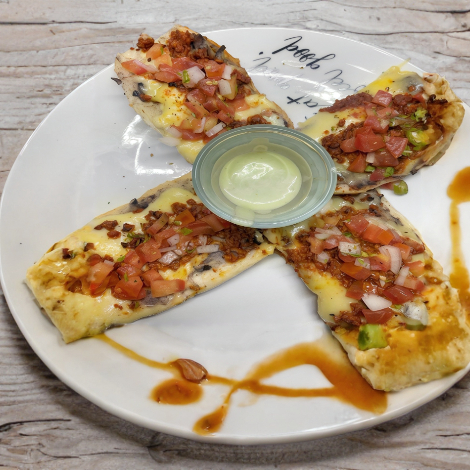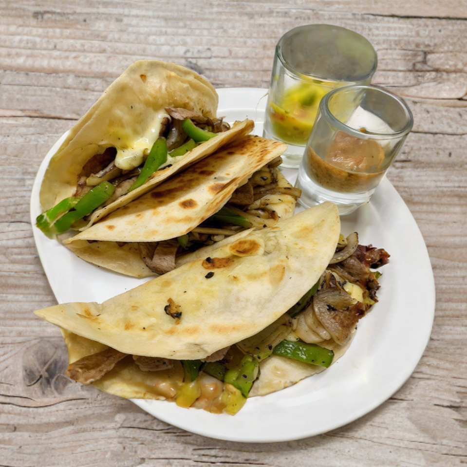 Tortilla de maíz o harina, rellena de carne jugosa a la plancha, gratinada con queso manchego, acompañado de pimiento, cebolla, salteada y salsas de la casa