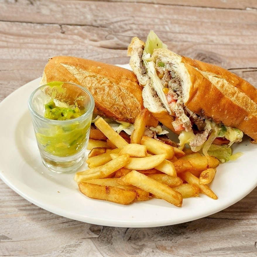 Baguette relleno de carne marinada y a la plancha, acompañado de cebolla salteada, guacamole, queso gratinado y guarnición de papas fritas