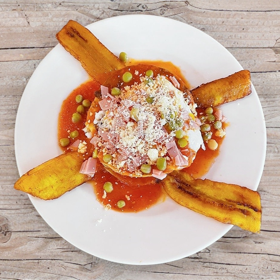 Tostadas de. Maíz con frijol, huevo estrellado termino a elegir delciosa salsa de tomate, Guarnición de platano frito